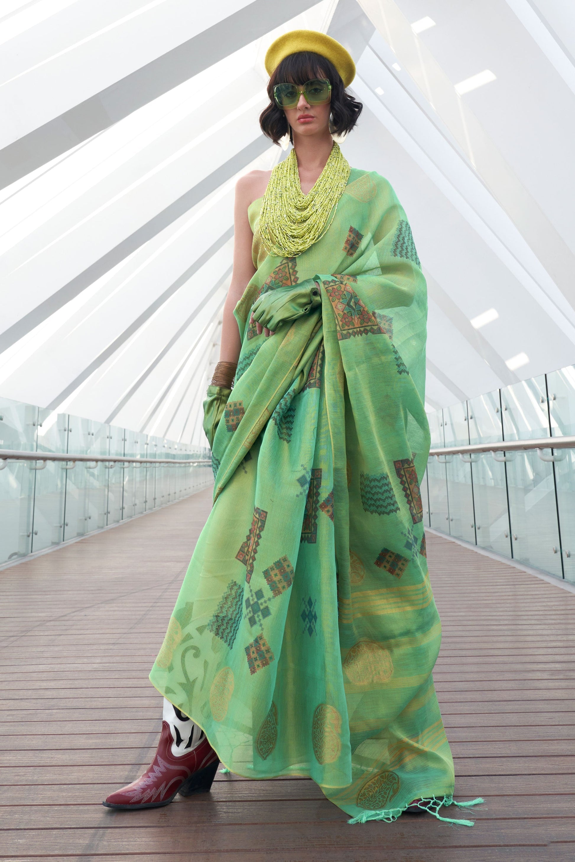 टेक्स्ट ब्लॉक आकर्षक आर्ट सिल्क फैब्रिक समुद्री हरे रंग की साड़ी प्रिंटेड वर्क के साथ