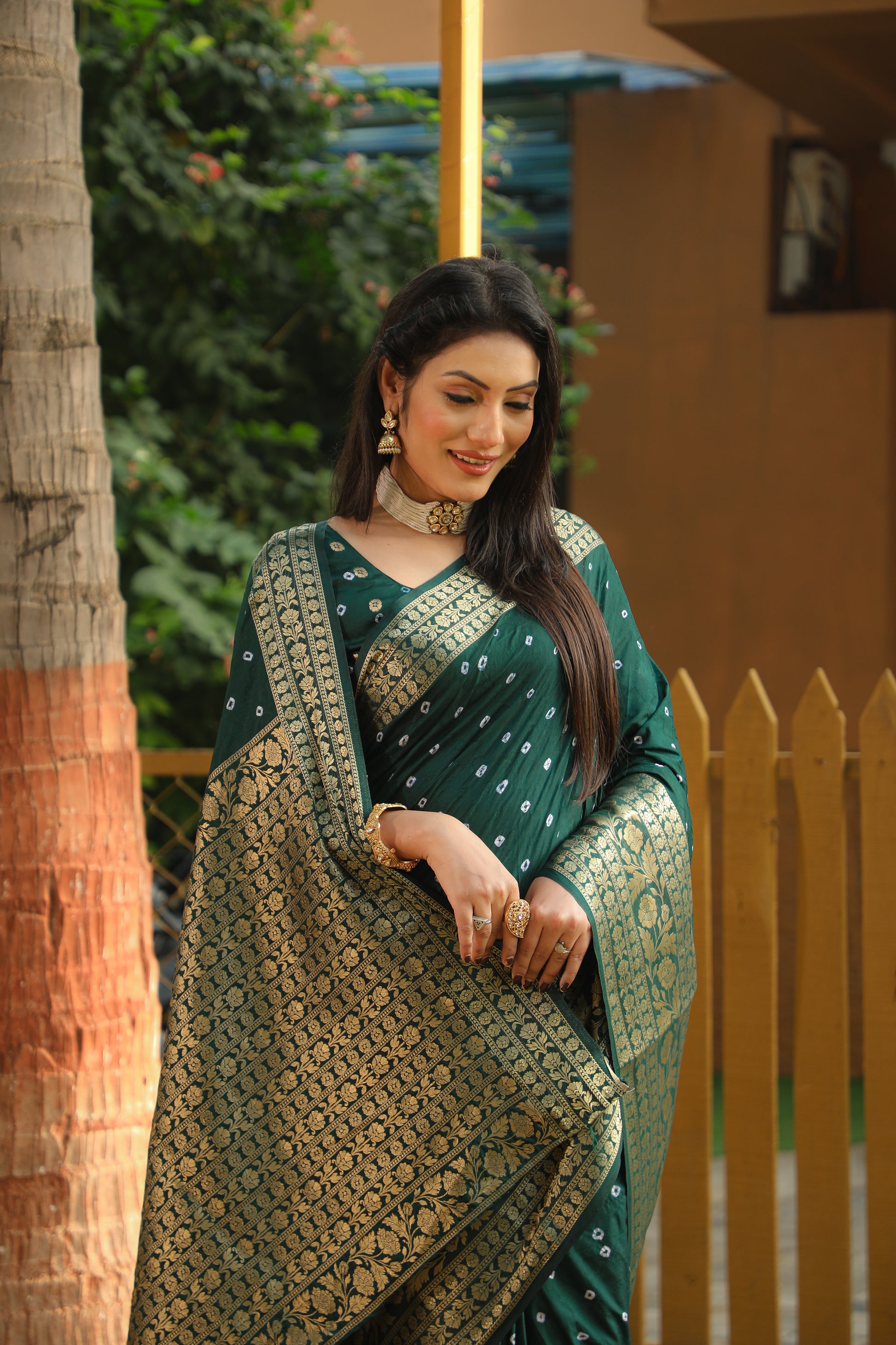 ज़री बुनाई वाले रिच पल्लू के साथ हरी तोरल बंधेज कांजीवरम सिल्क साड़ी
