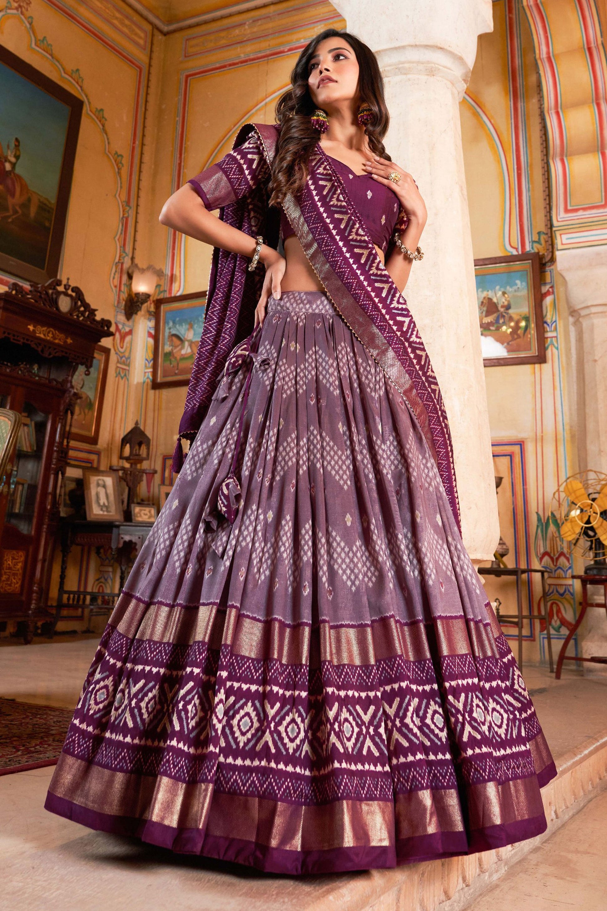 टेक्स्ट ब्लॉक ट्रेंडी आर्ट सिल्क फ़ैब्रिक पर्पल कलर का लहंगा फ़ॉइल प्रिंटेड वर्क के साथ