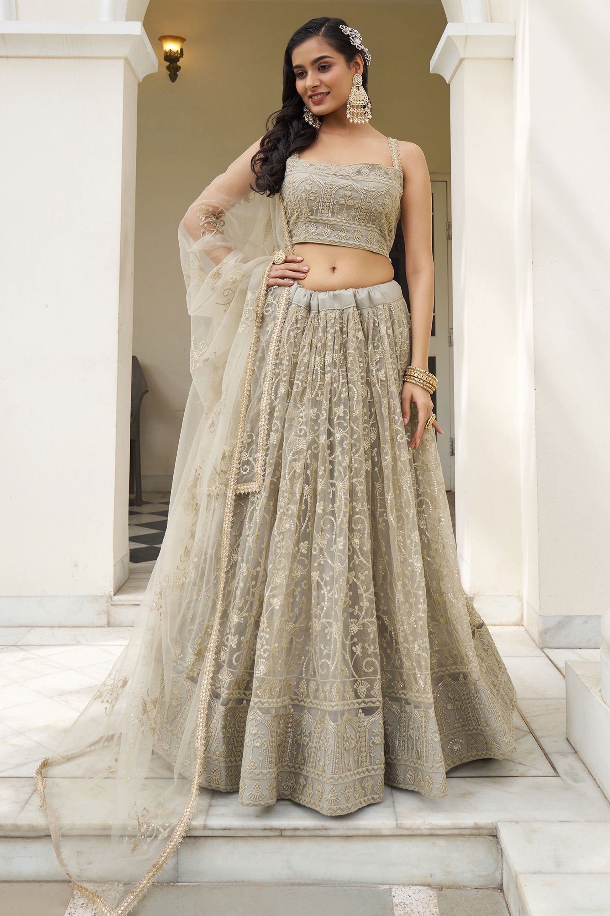 ट्रेंडी नेट फैब्रिक बेज कलर लेहेंगा सेक्विन वर्क के साथ
