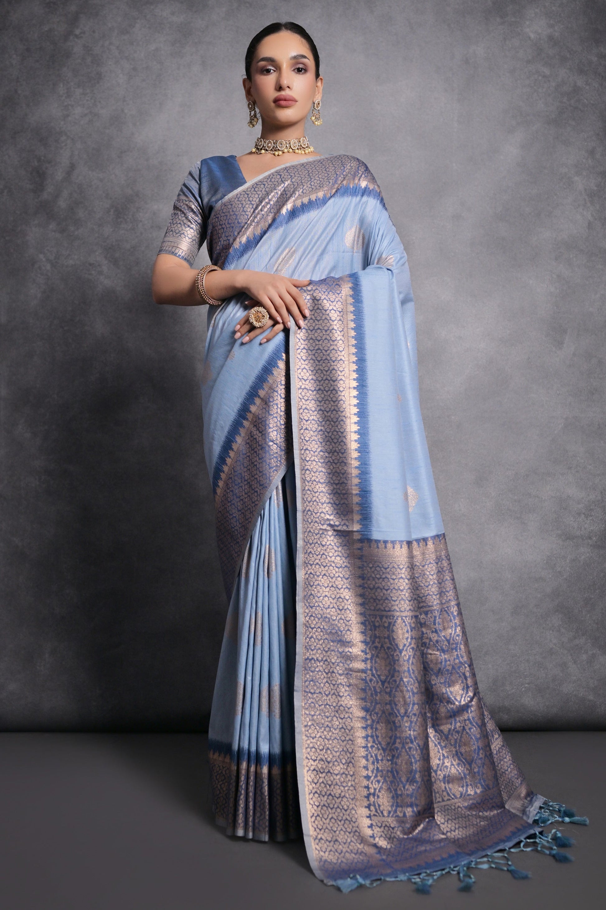 नीले रंग में टसर सिल्क ज़री बुनाई बॉर्डर वर्क साड़ी