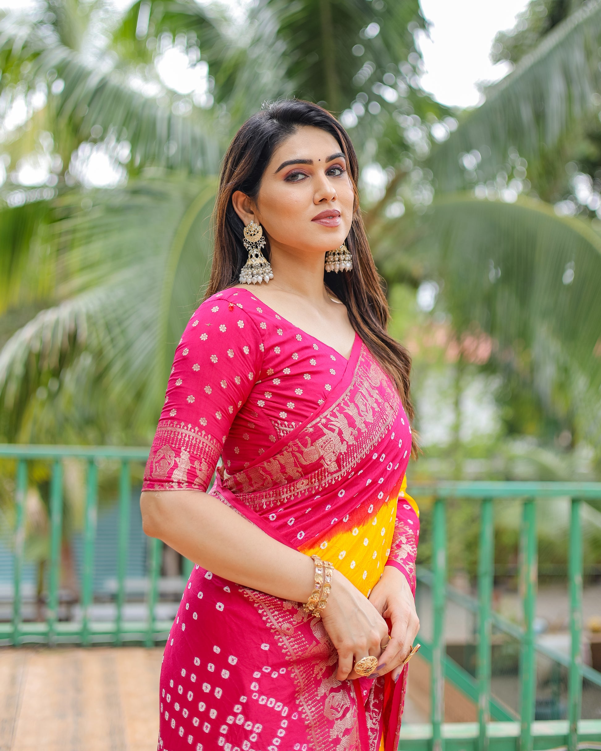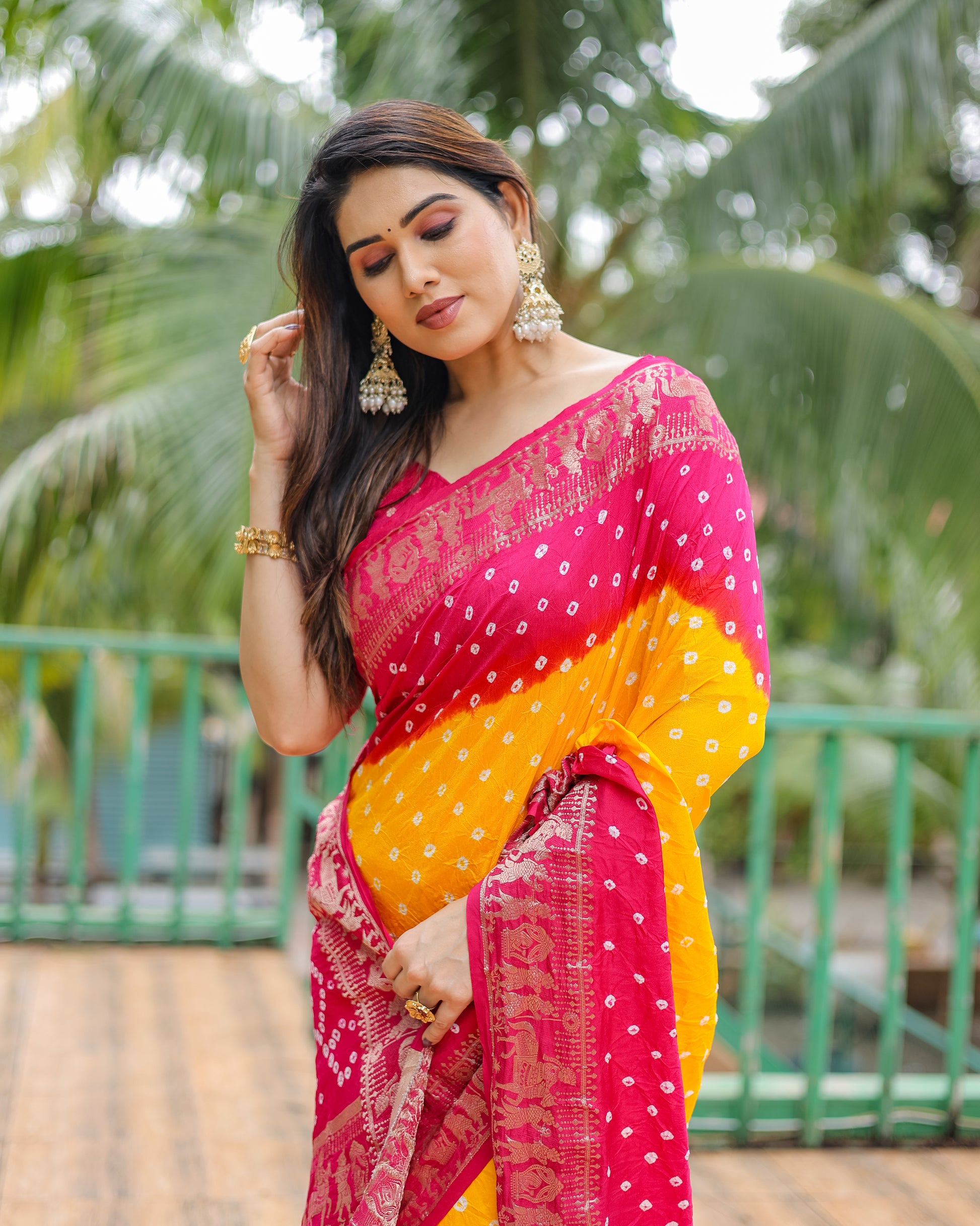 साड़ी का फ़ैब्रिक: बंधेज सिल्क साड़ी ज़री बुनाई वाले रिच टिश्यू पल्लू के साथ