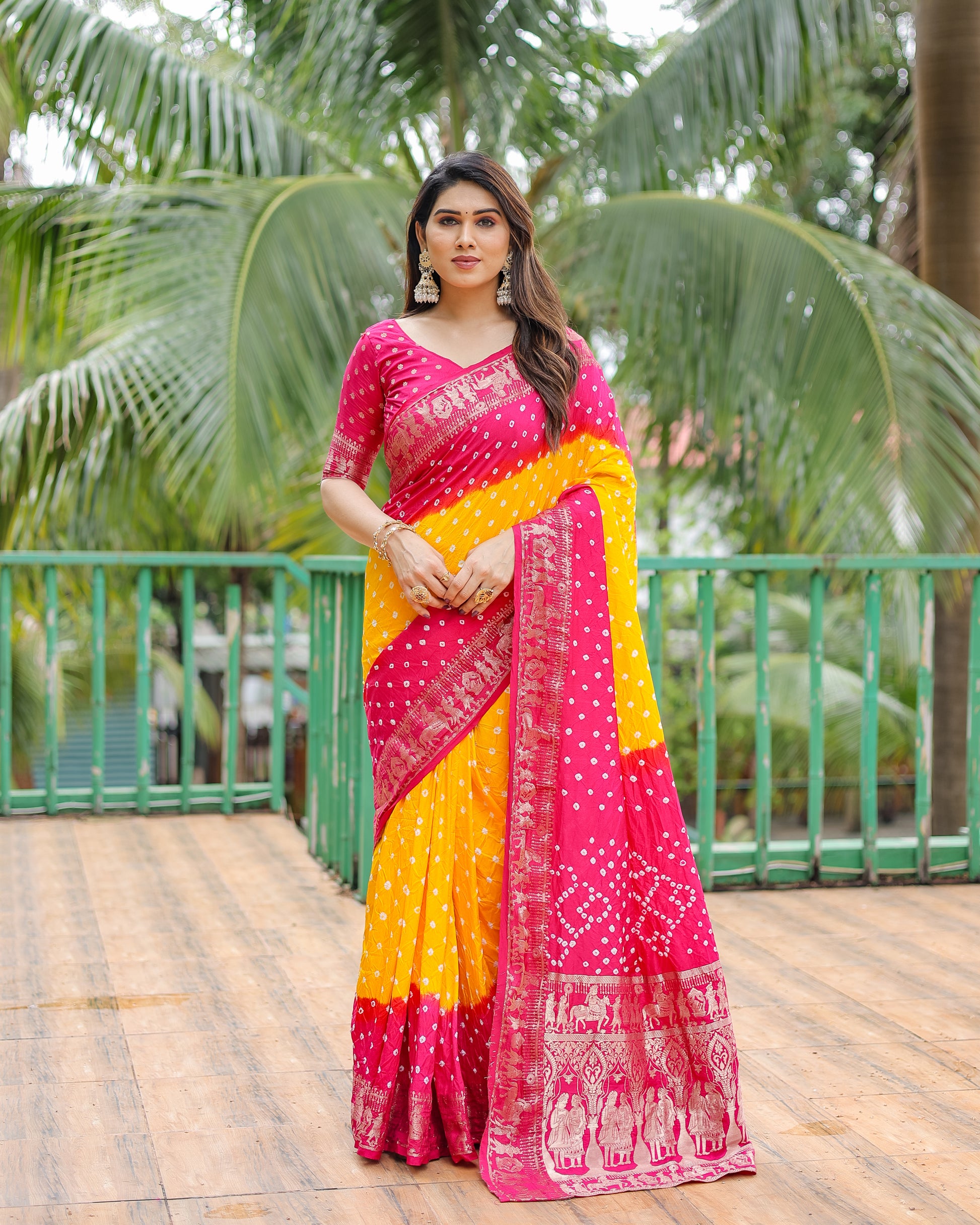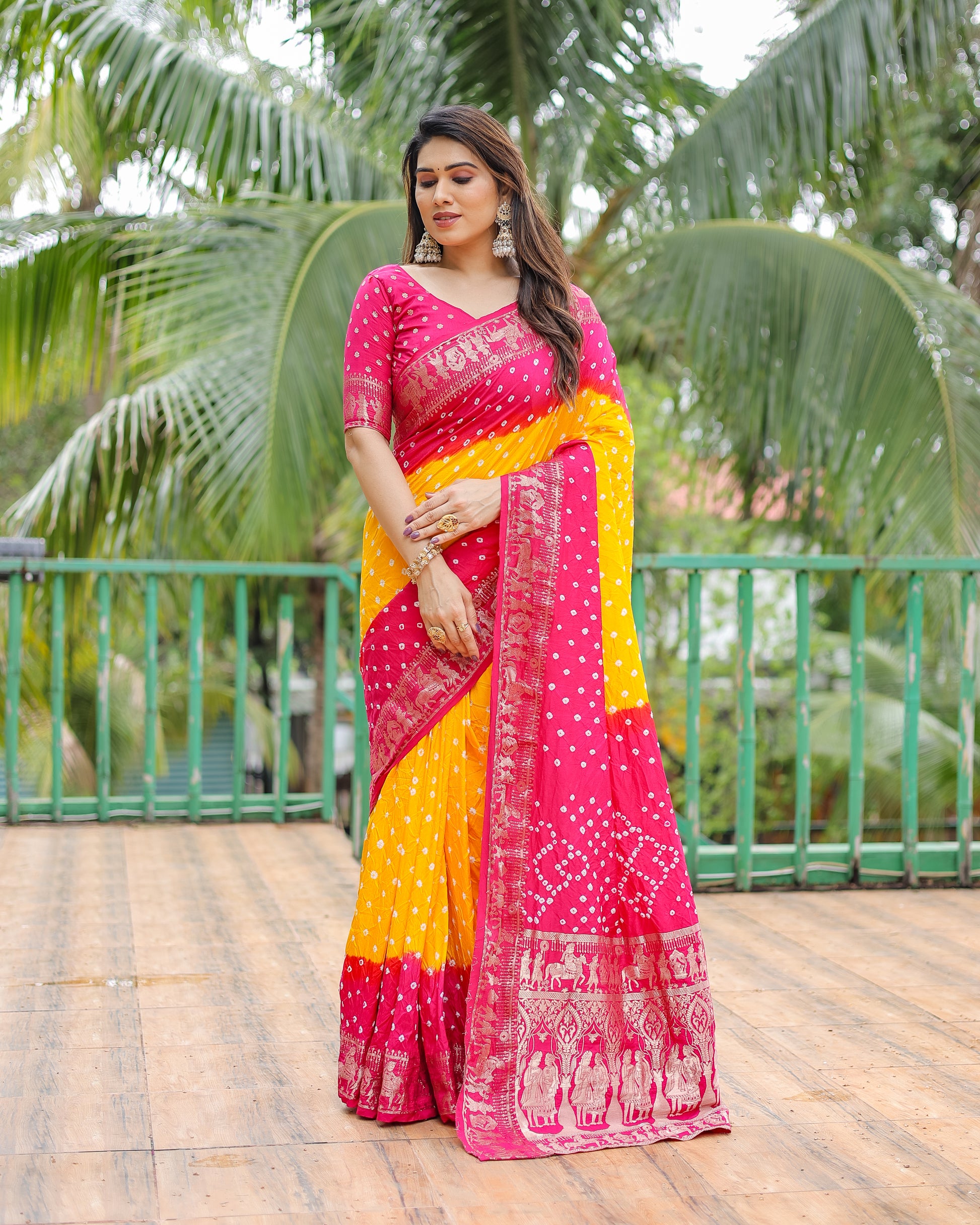 ज़री बुनाई रिच टिश्यू पल्लू के साथ पीली वामिका बंधेज सिल्क साड़ी