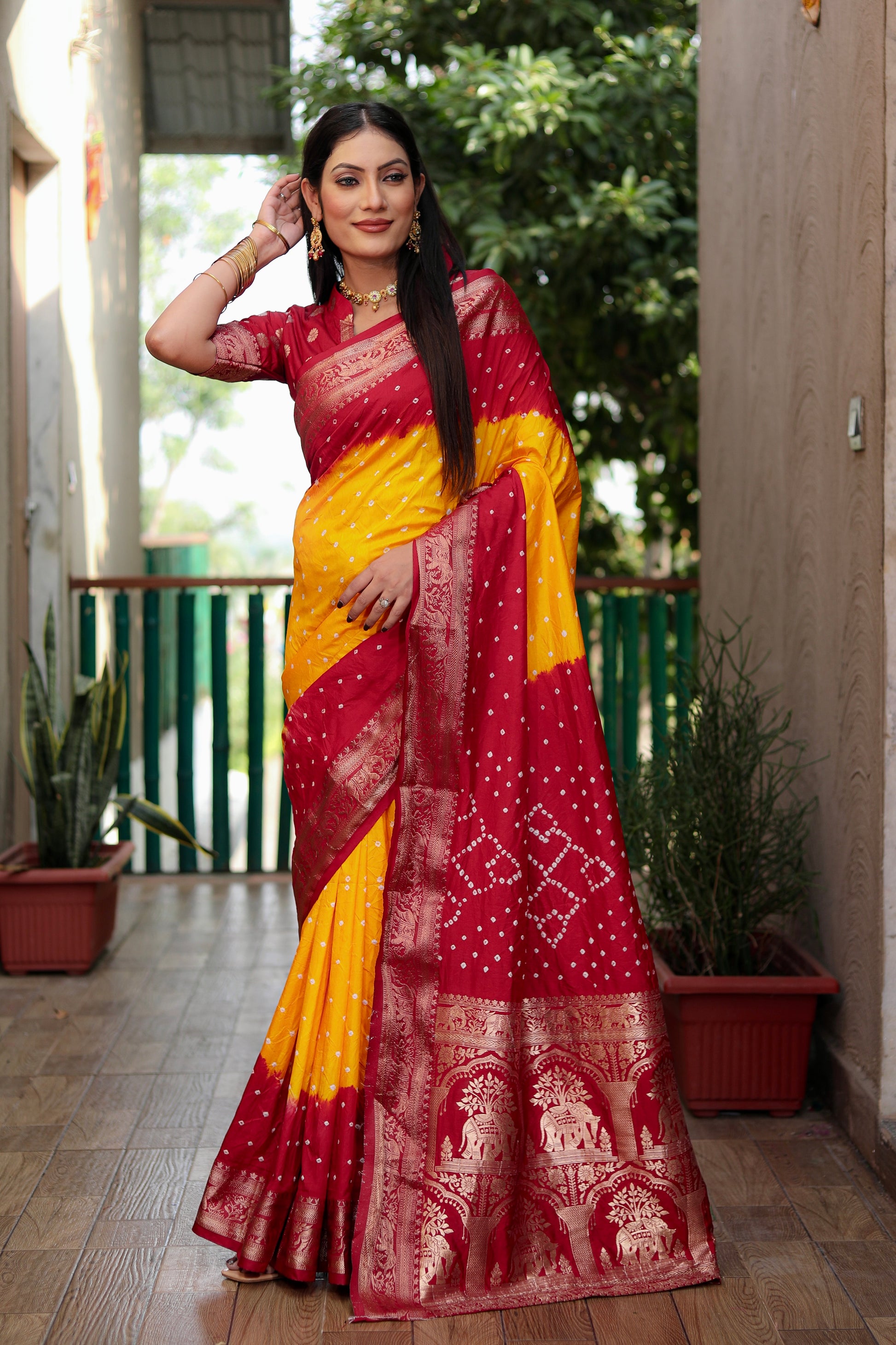 ज़री बॉर्डर रिच टिश्यू पल्लू के साथ बंधेज बॉर्डर वाली पीली वाहिनी बंधेज सिल्क साड़ी