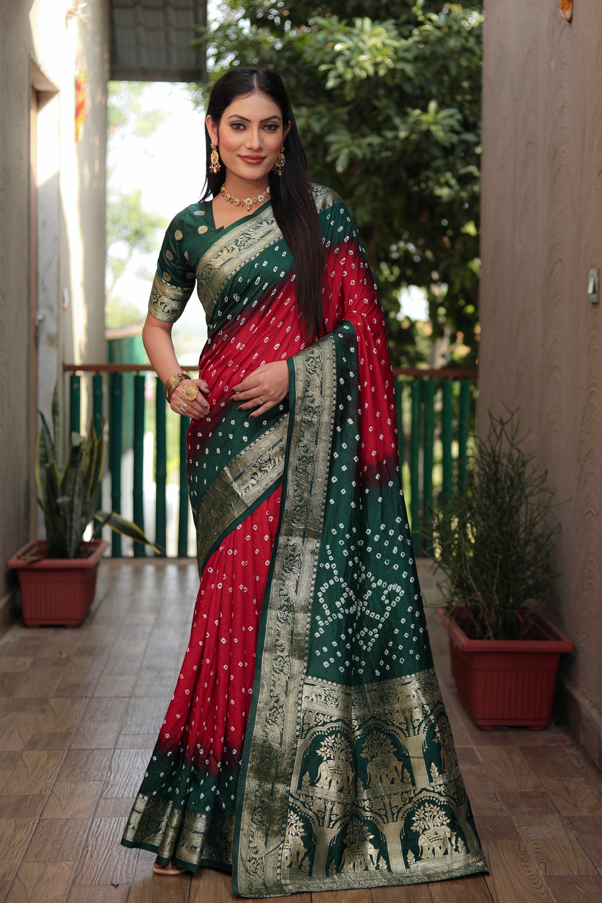 लाल वाहिनी बंधेज सिल्क साड़ी बंधेज बॉर्डर के साथ ज़री बॉर्डर रिच टिश्यू पल्लू के साथ