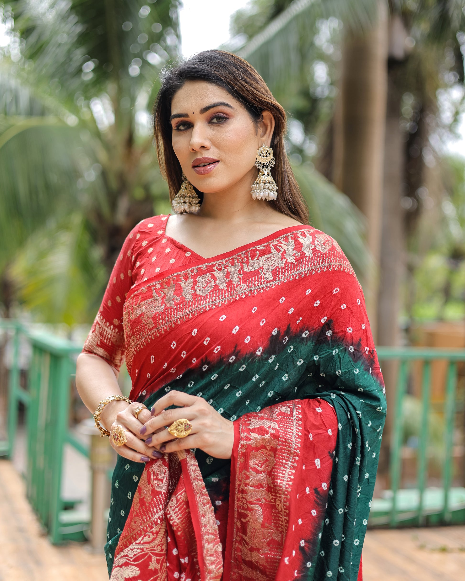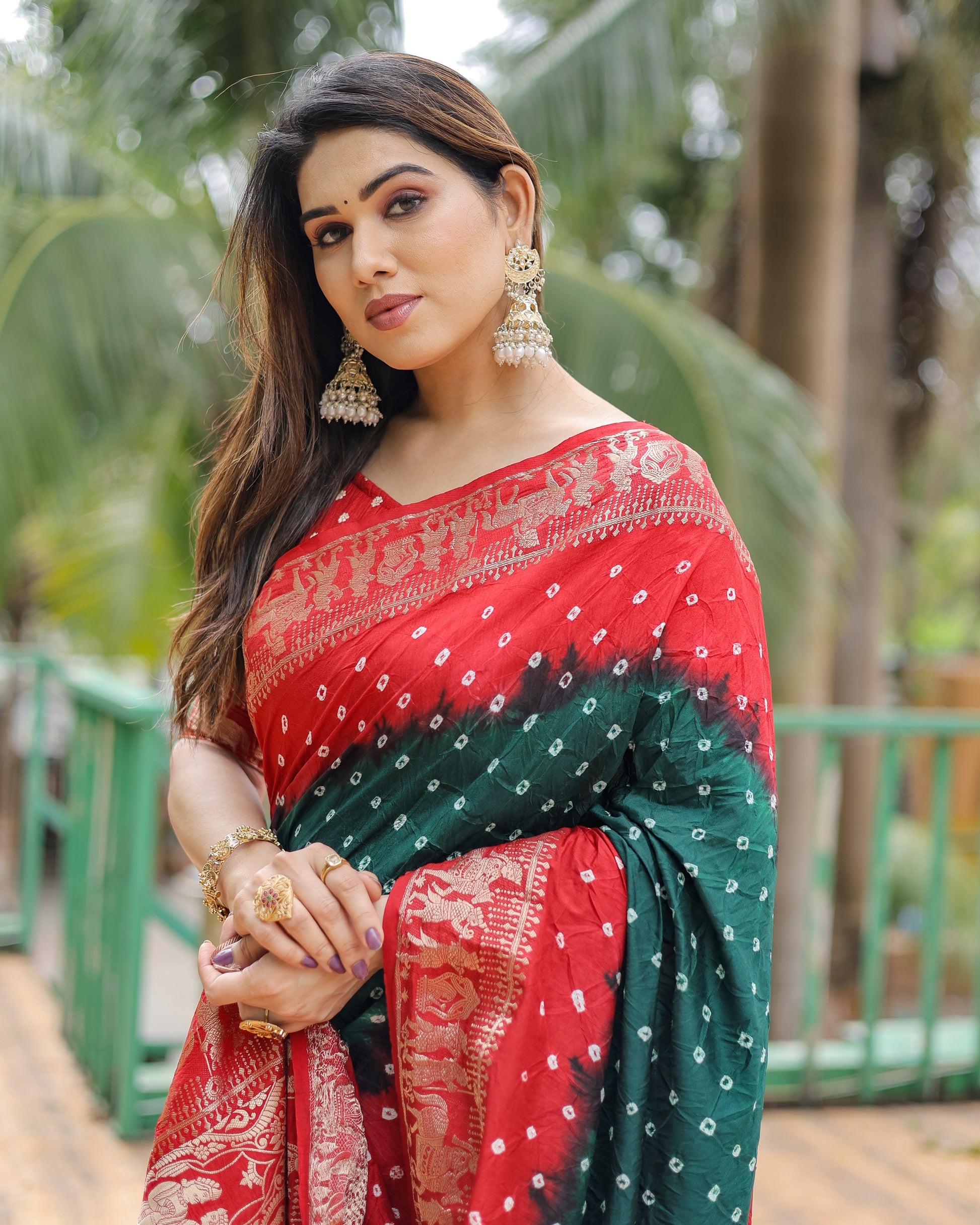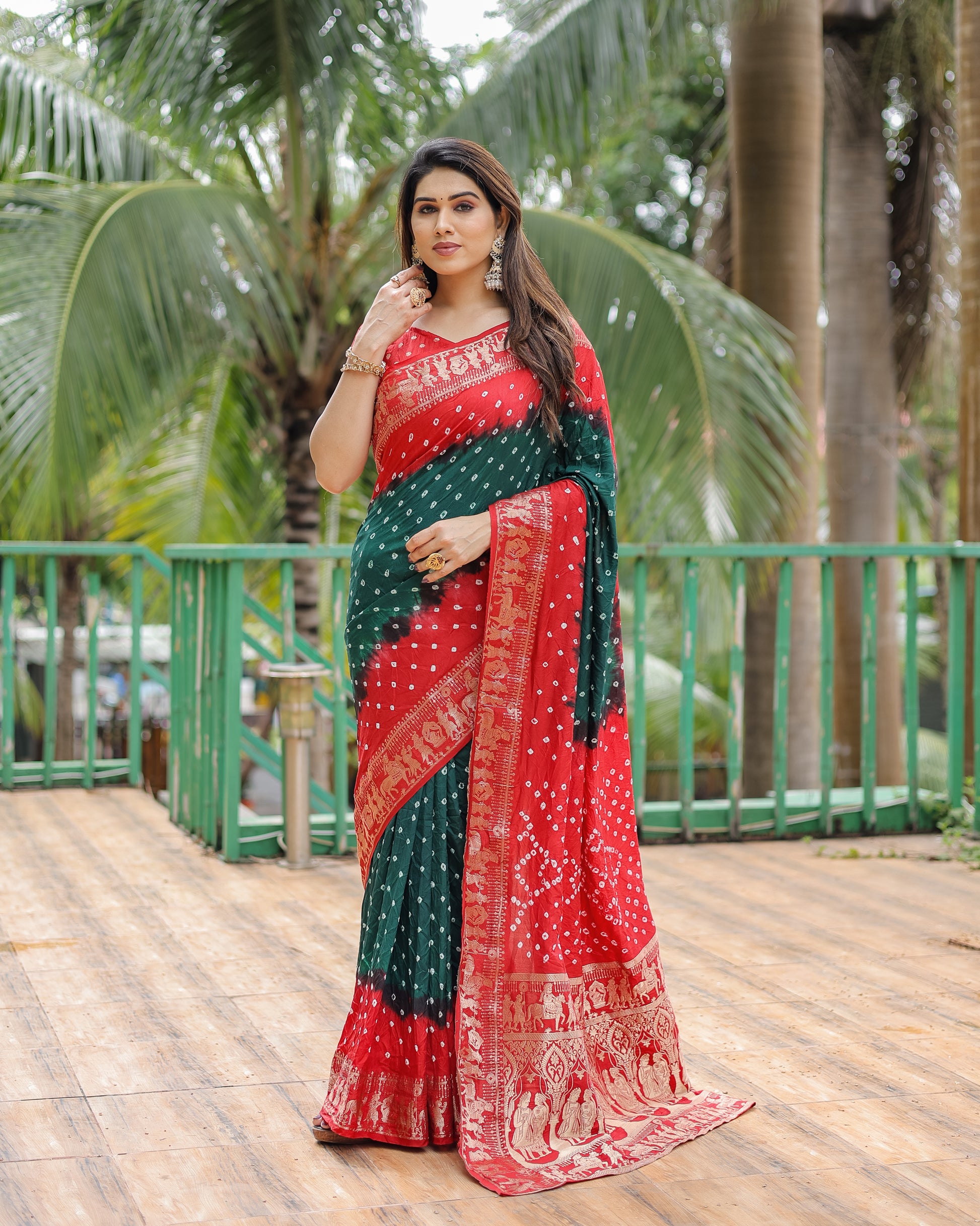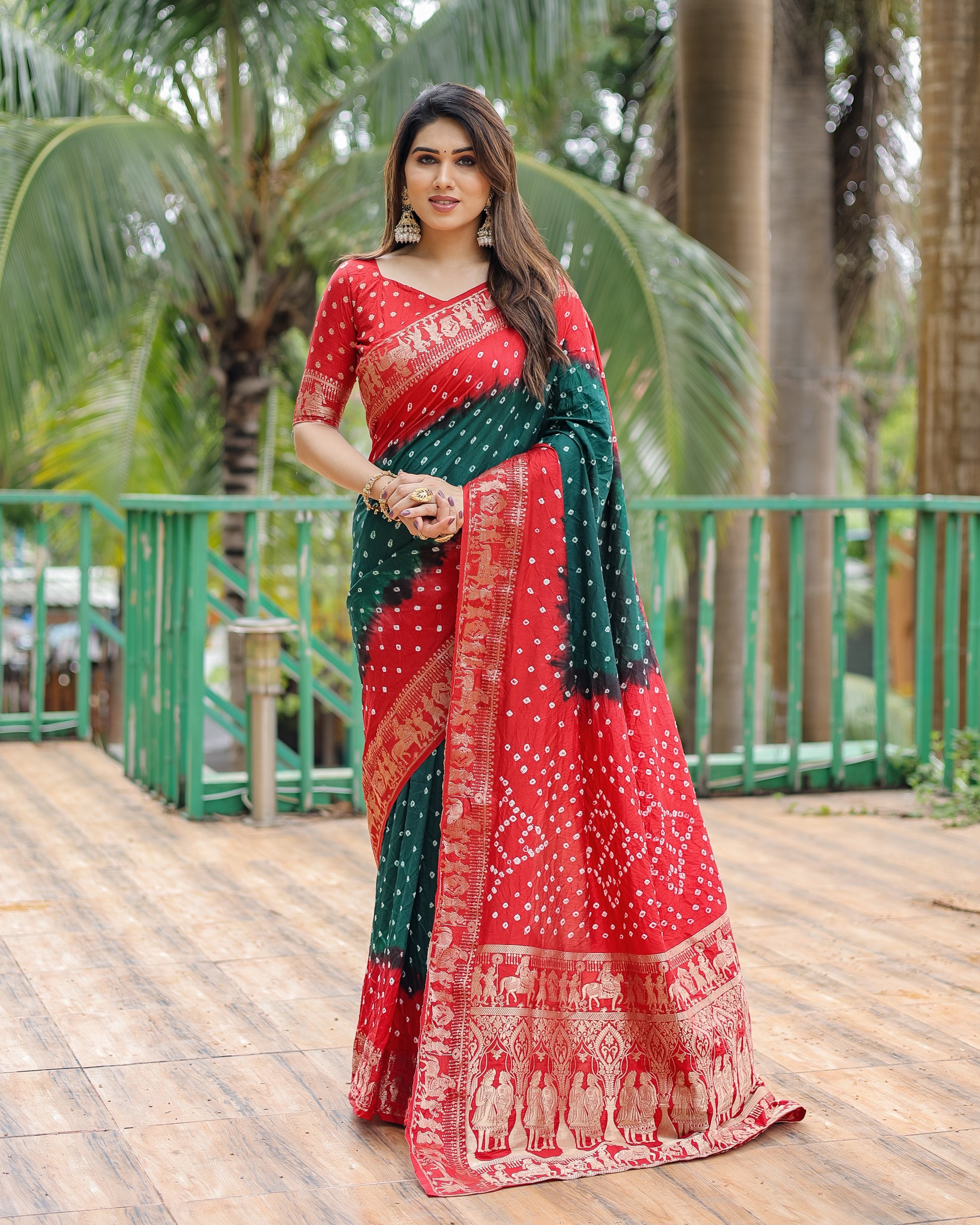 ज़री बुनाई रिच टिश्यू पल्लू के साथ हरी वामिका बंधेज सिल्क साड़ी