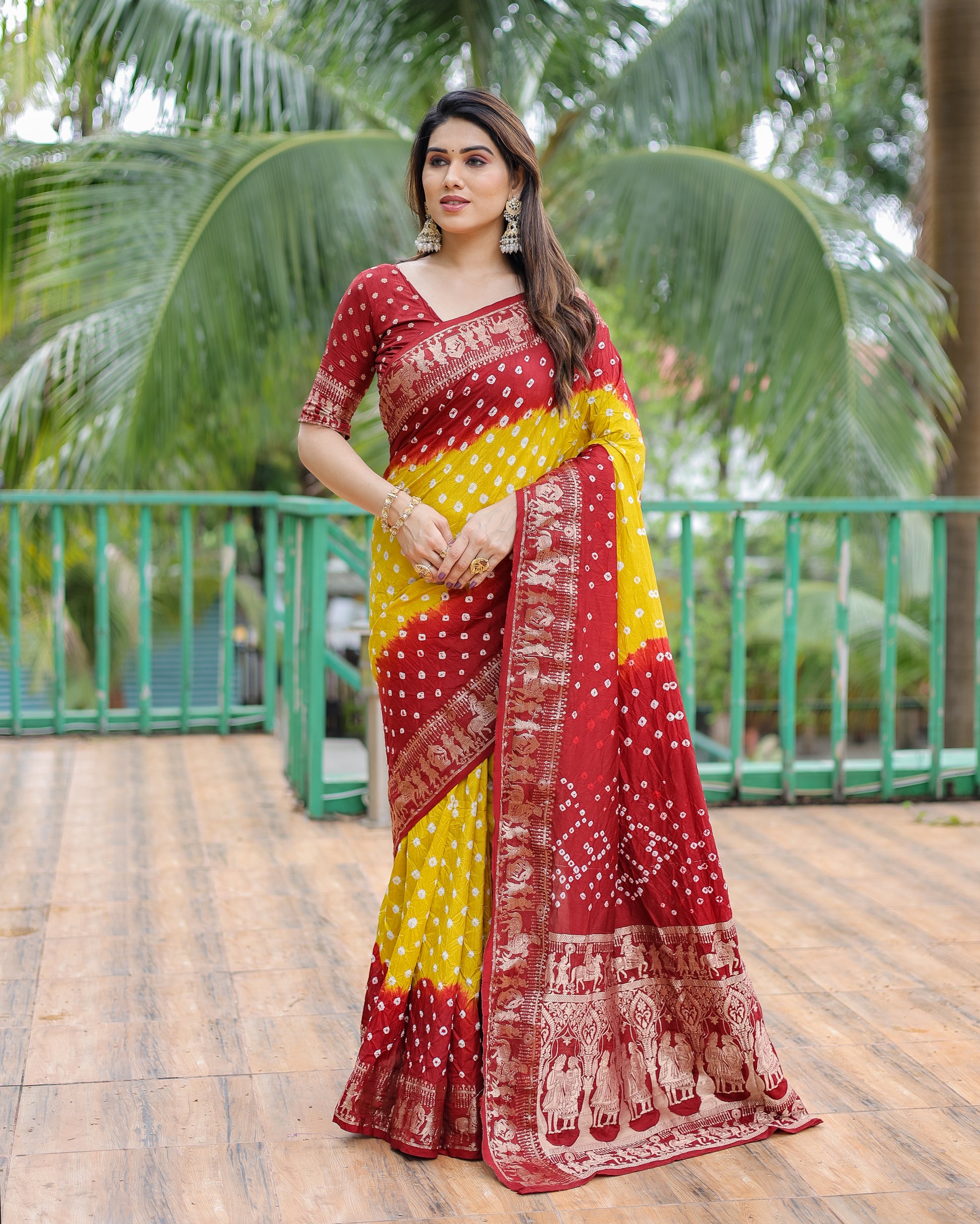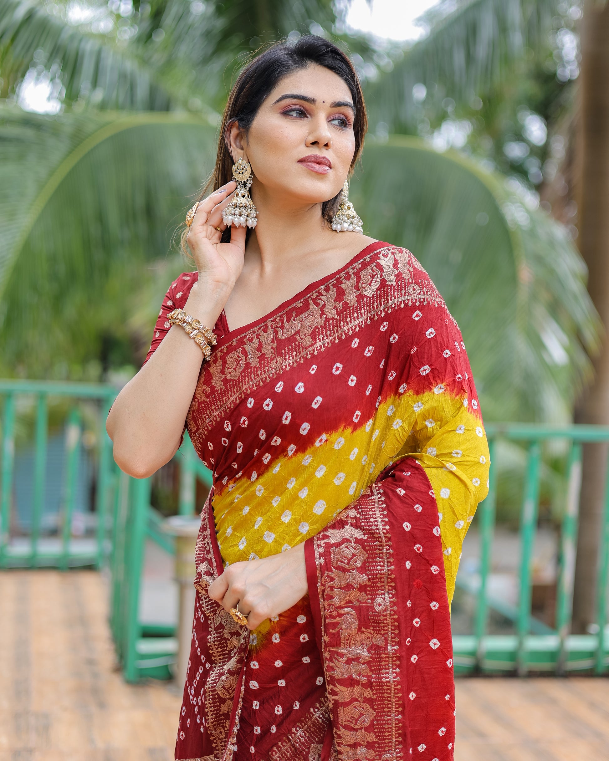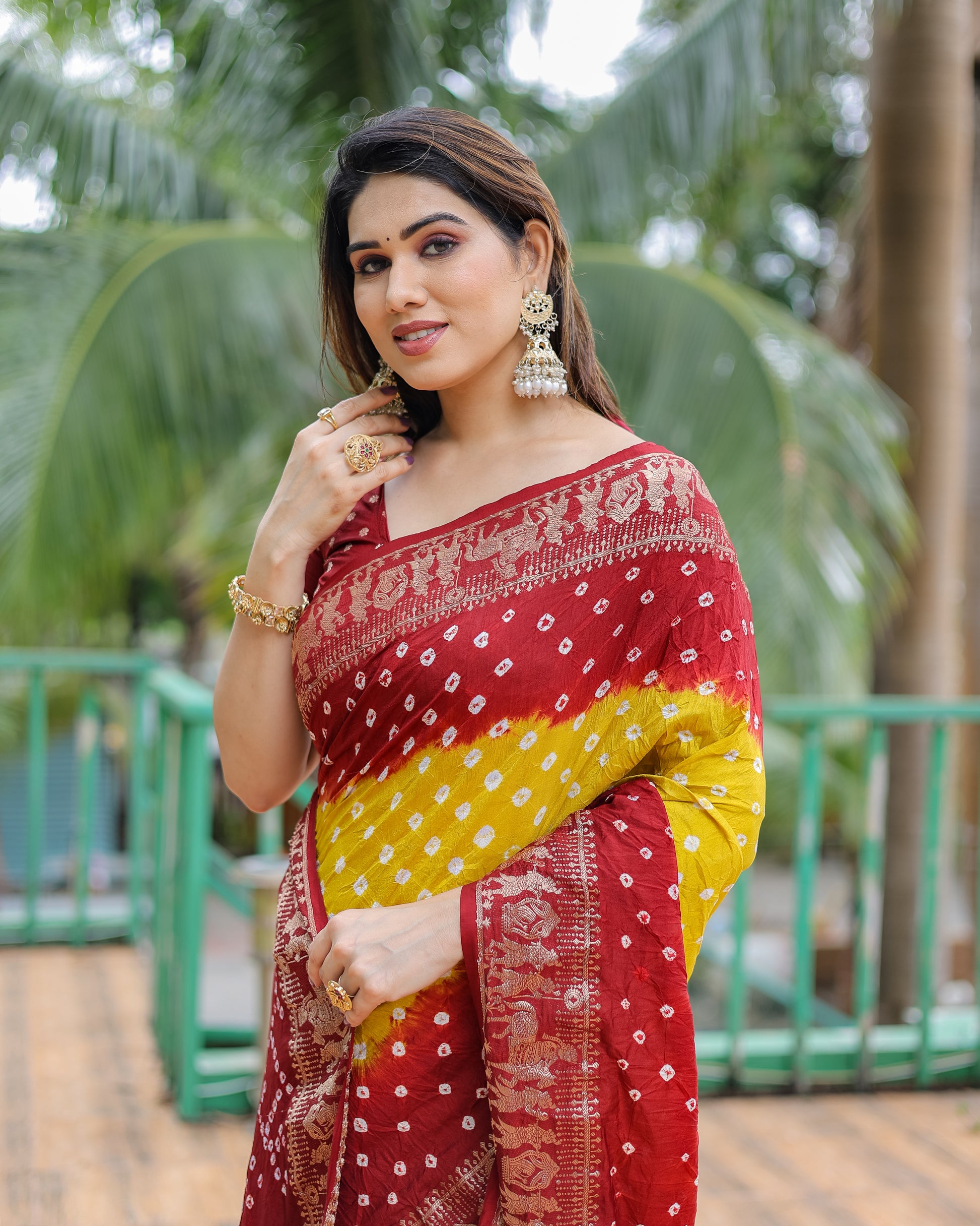 साड़ी का फ़ैब्रिक: बंधेज सिल्क साड़ी ज़री बुनाई वाले रिच टिश्यू पल्लू के साथ