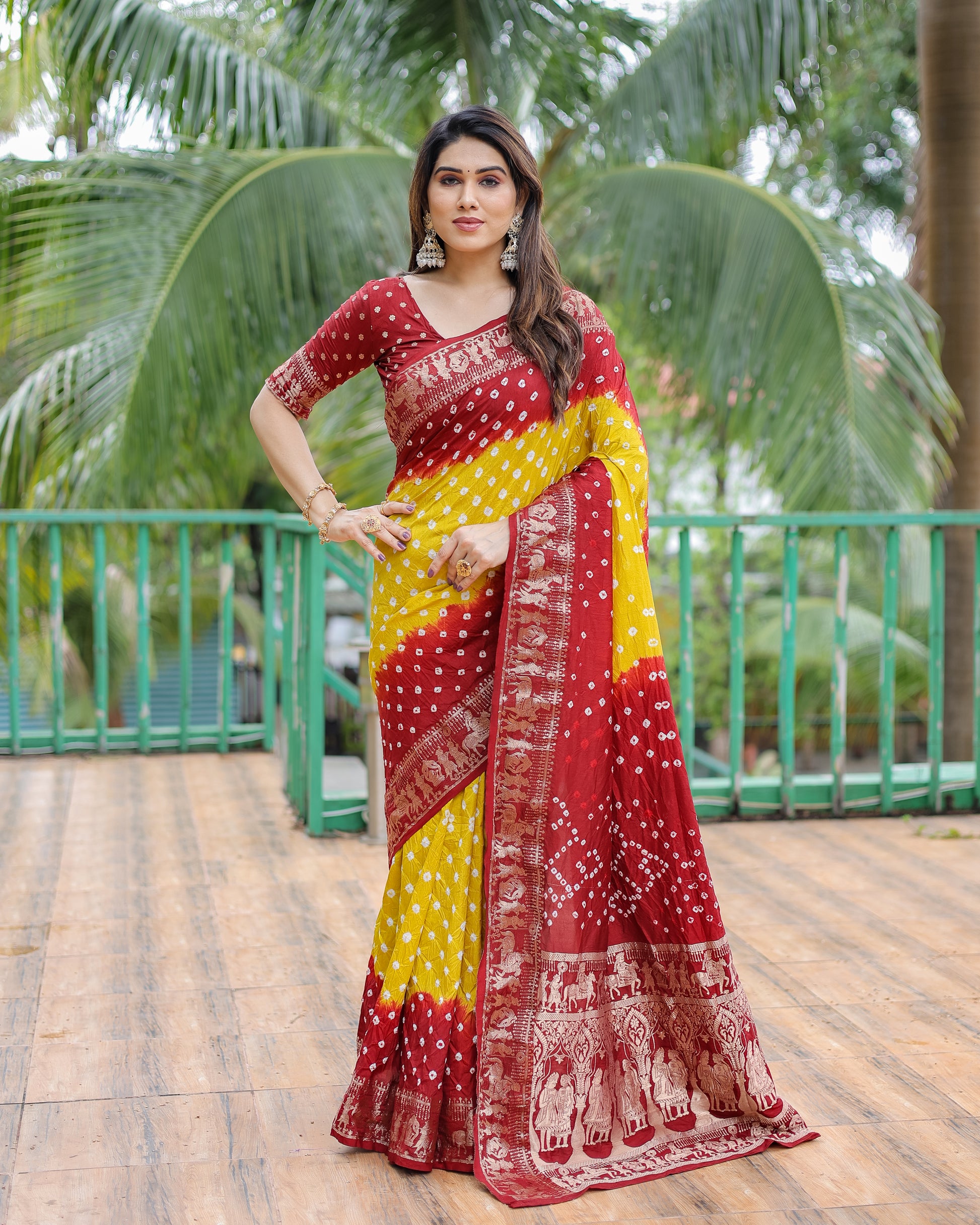 लेमन येलो वामिका बंधेज सिल्क साड़ी ज़री बुनाई रिच टिश्यू पल्लू के साथ