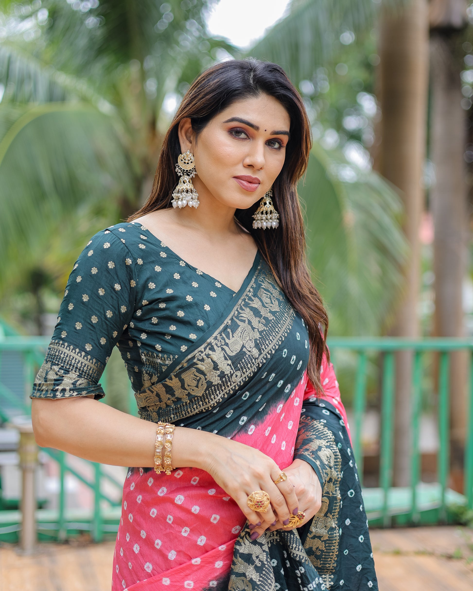 ज़री बुनाई रिच टिश्यू पल्लू के साथ गुलाबी वामिका बंधेज सिल्क साड़ी