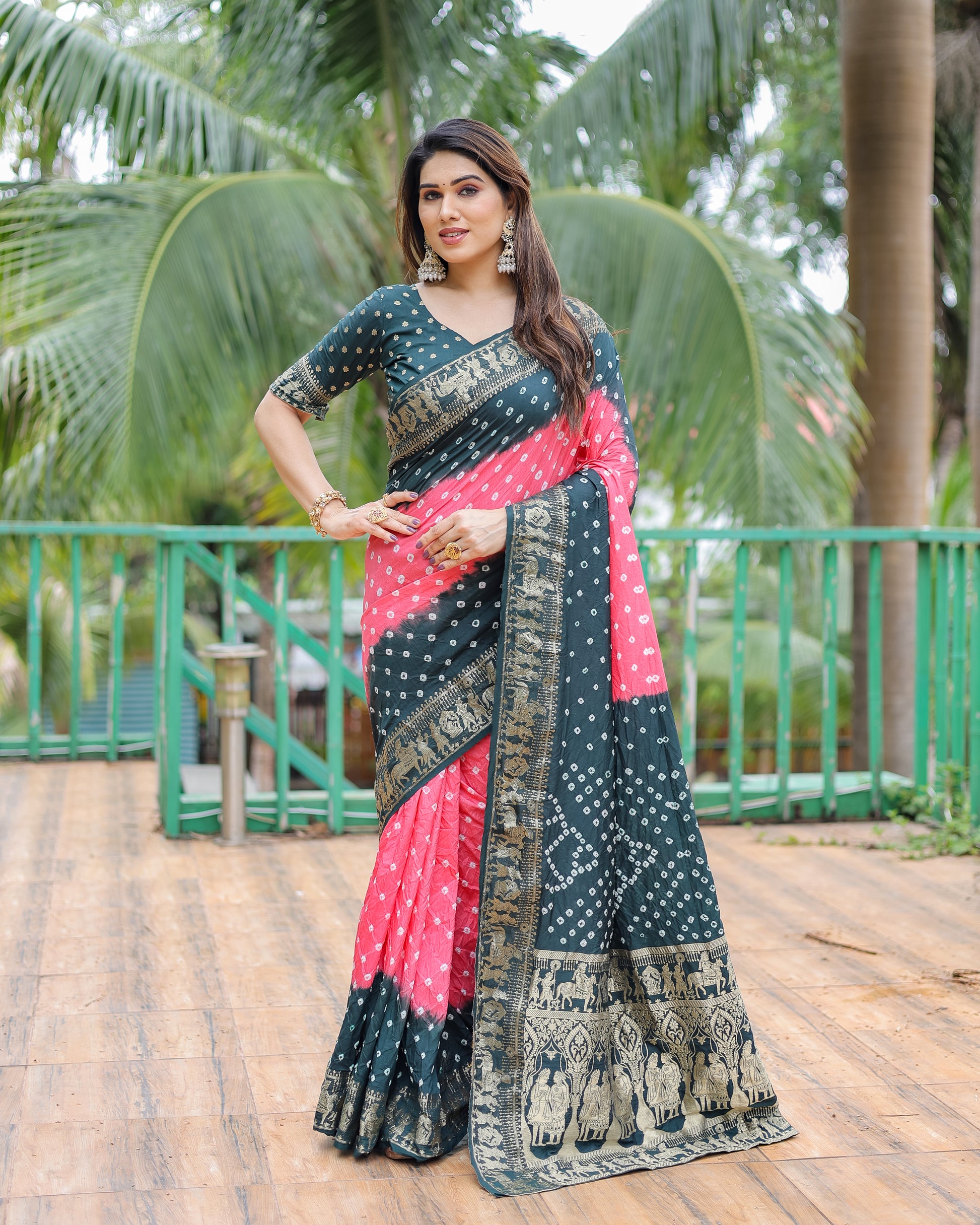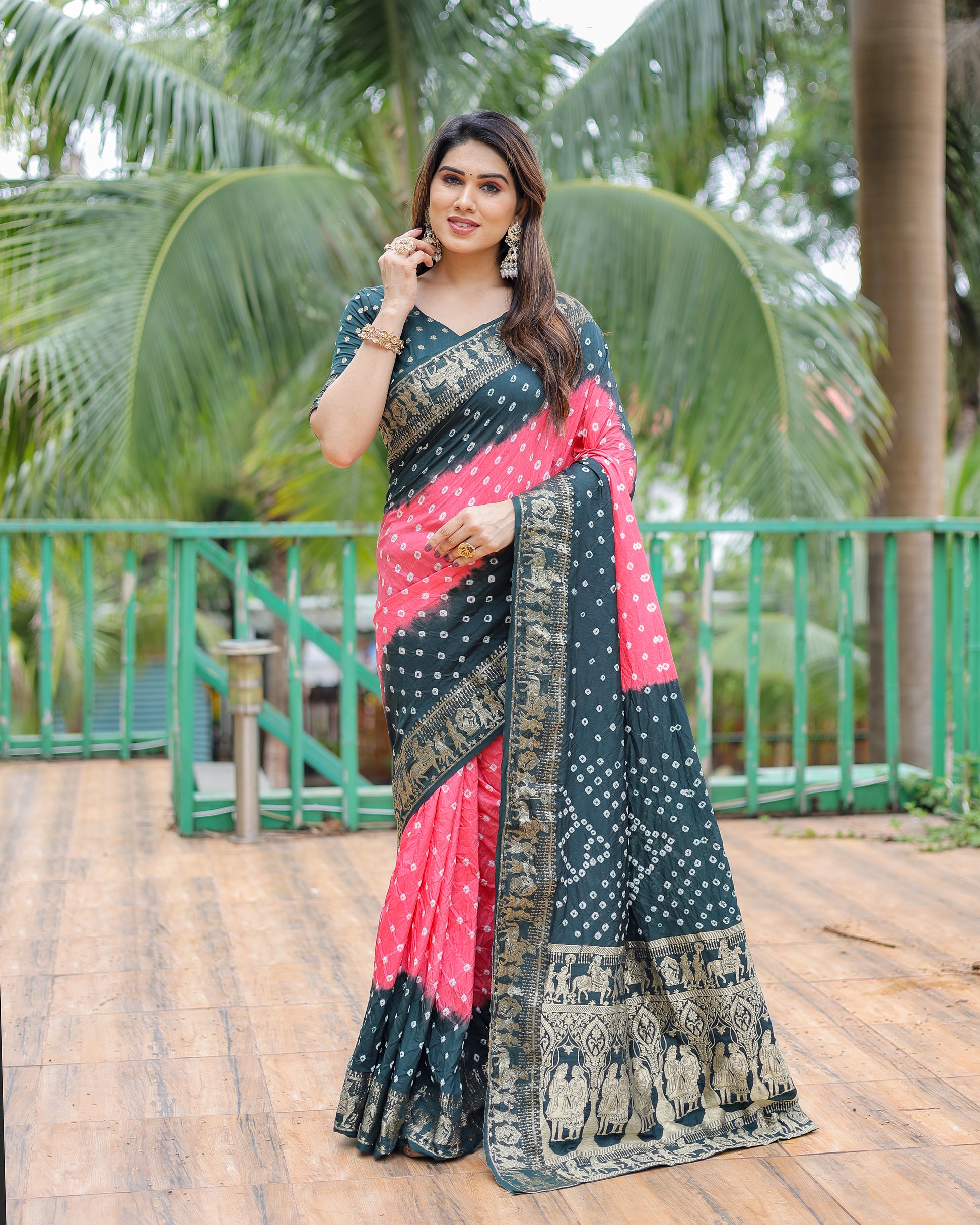 साड़ी का फ़ैब्रिक: बंधेज सिल्क साड़ी ज़री बुनाई वाले रिच टिश्यू पल्लू के साथ