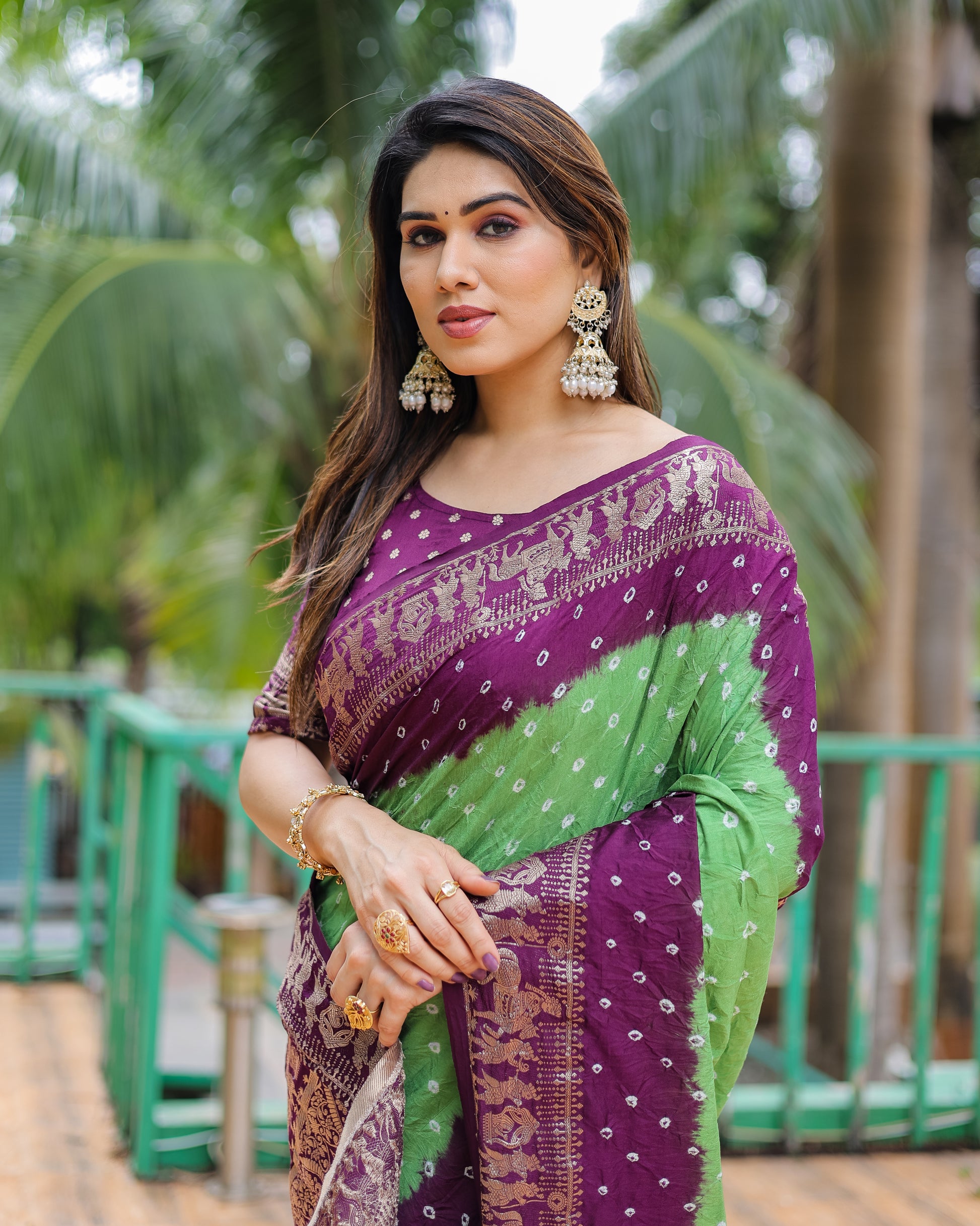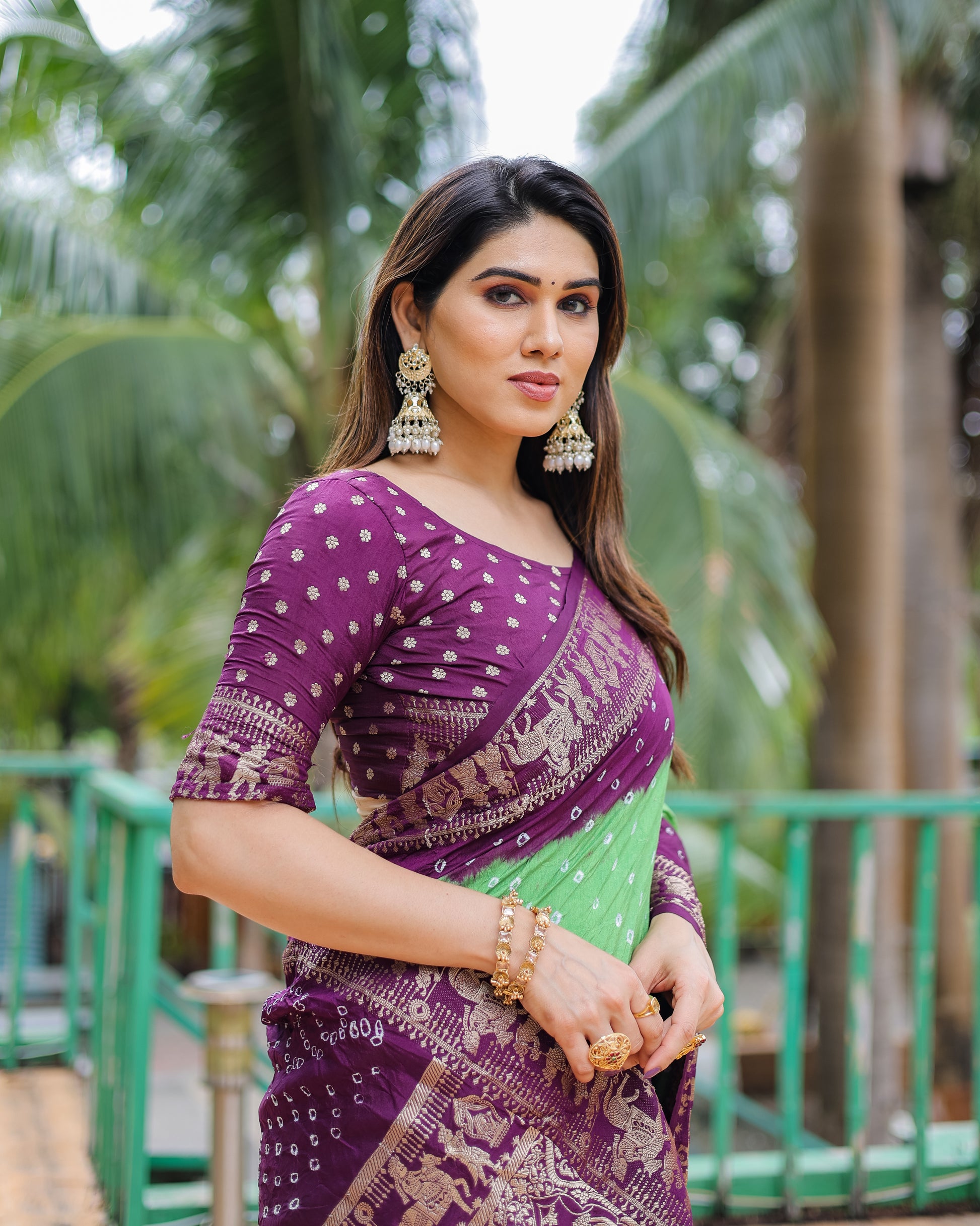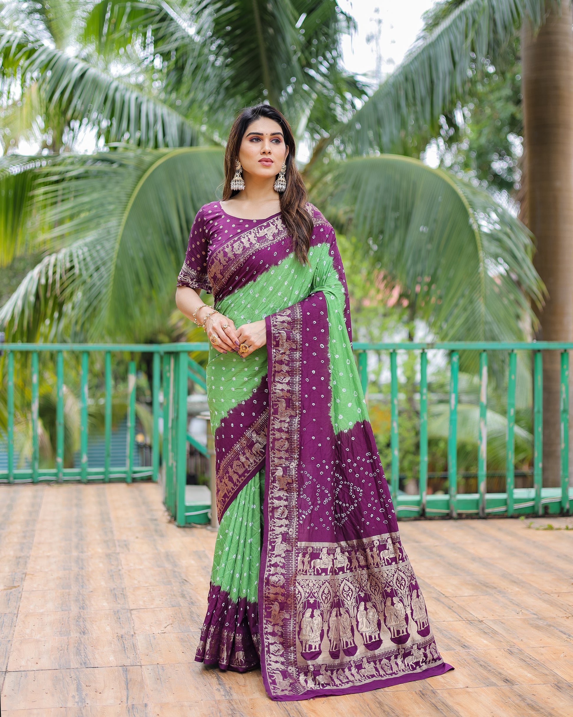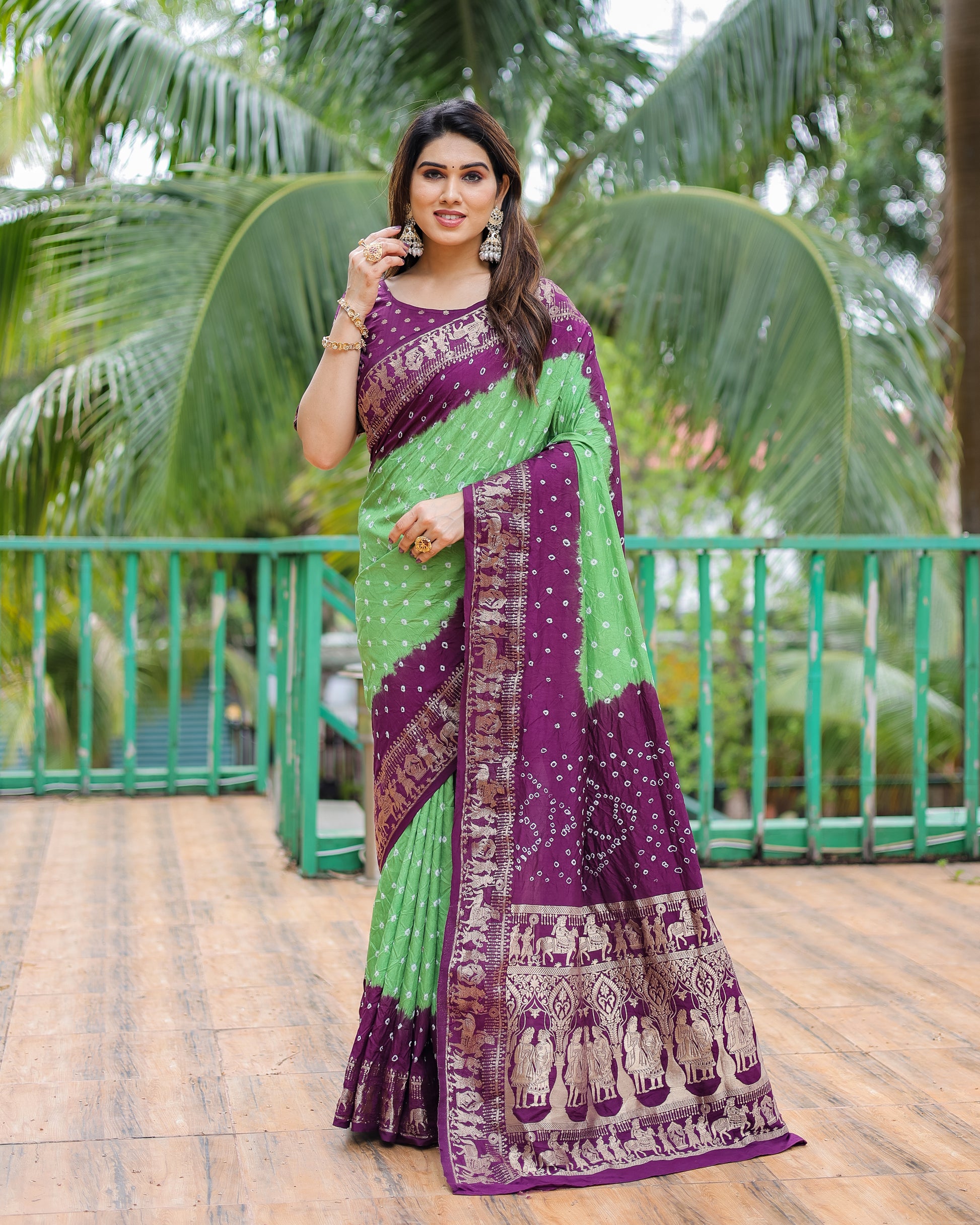 हल्के हरे रंग की वामिका बंधेज सिल्क साड़ी ज़री बुनाई वाले रिच टिश्यू पल्लू के साथ