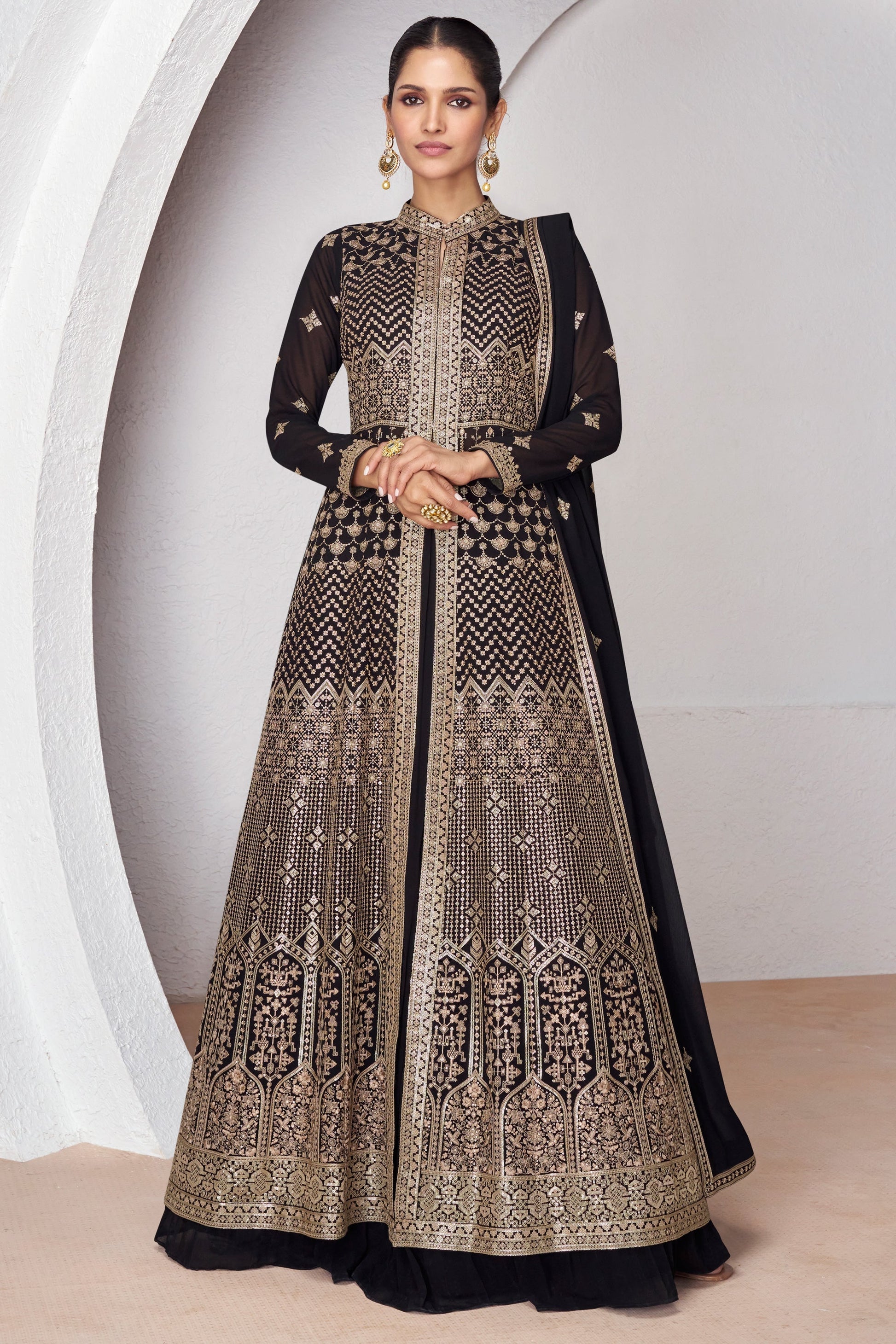 टेक्स्ट ब्लॉक वर्तिका सिंह ब्लैक कलर ल्यूमिनस रेडीमेड जॉर्जेट शरारा टॉप लहंगा