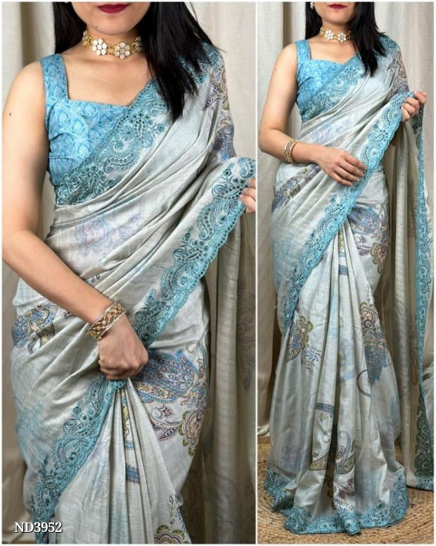 विस्का स्लब सिल्क डिजिटल प्रिंट धागे के साथ, कट वर्क और बोअरिंग पैटर्न के साथ कढ़ाई का काम। ब्लाउज- डिजिटल प्रिंट.