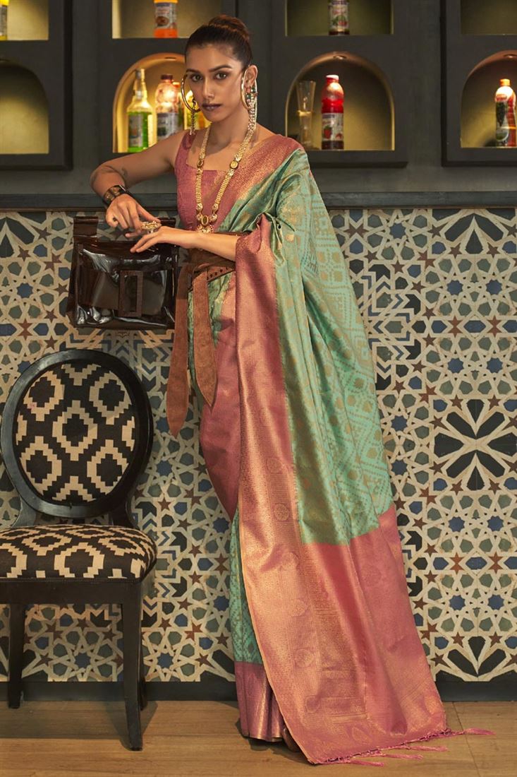 बुनाई का काम समुद्री हरा रंग कला रेशम चमकदार साड़ी