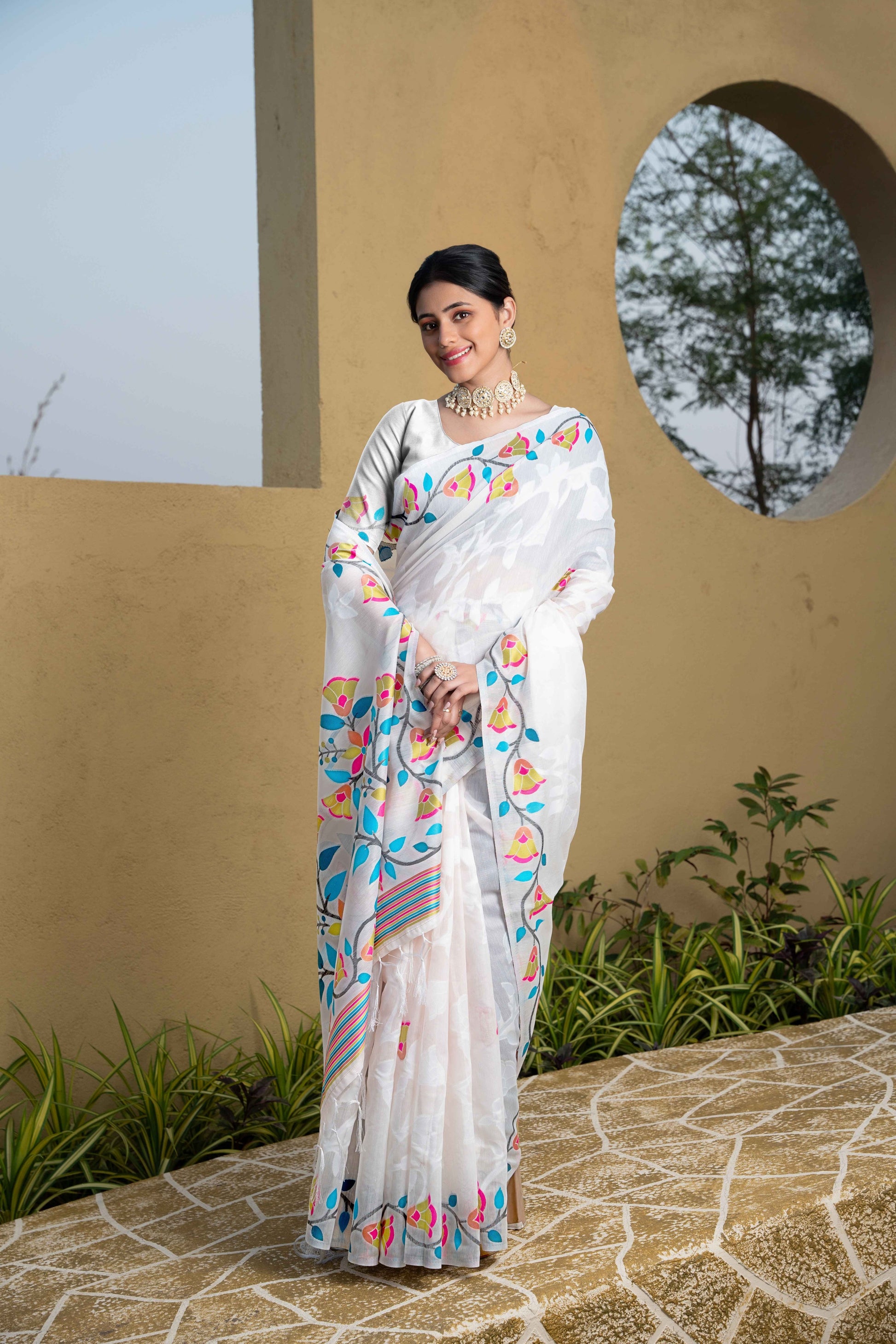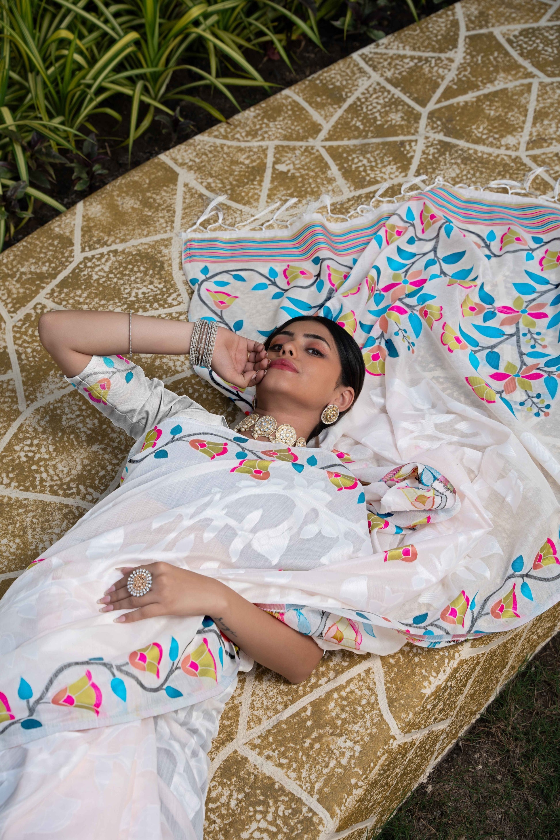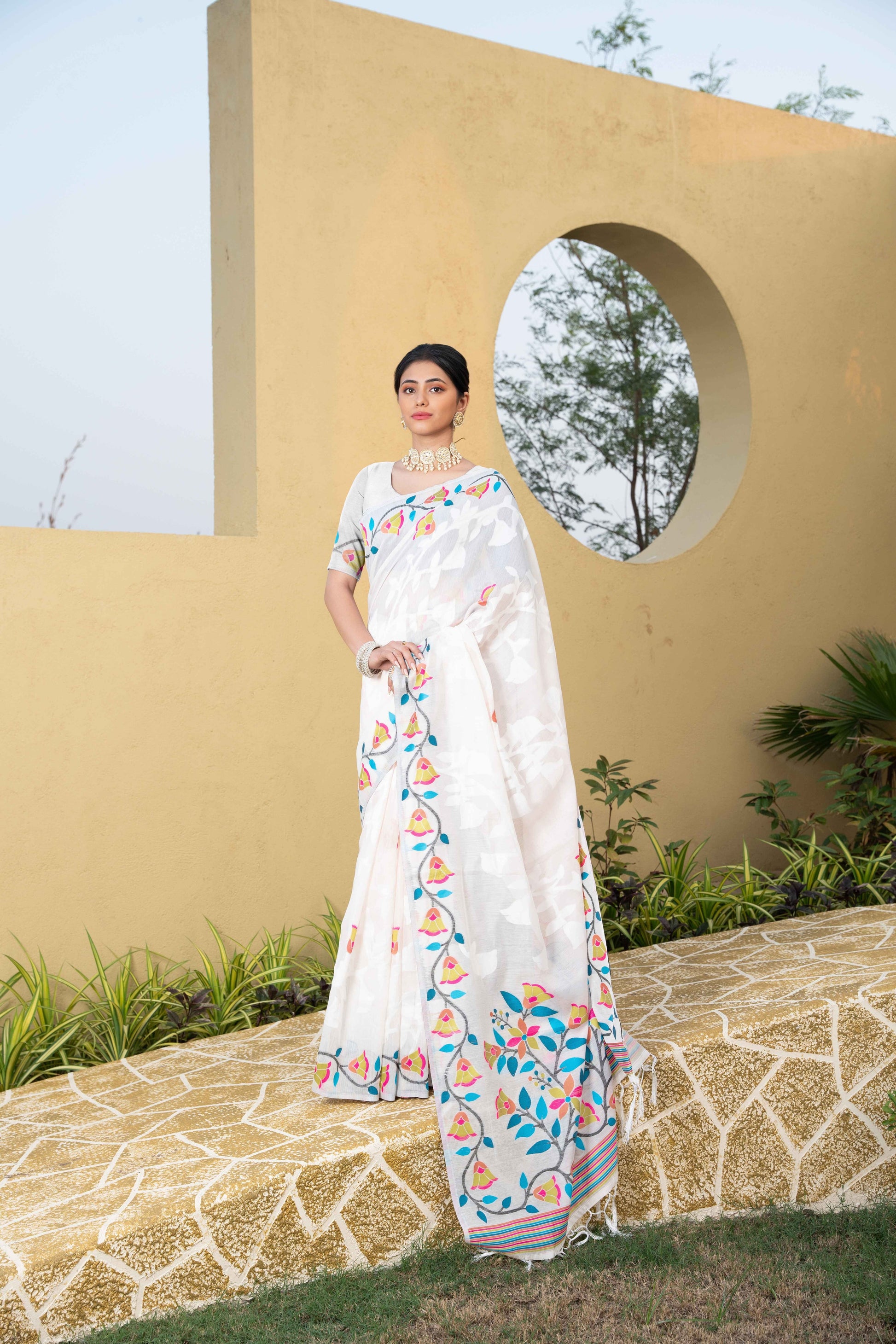सफ़ेद रंग की जामदानी सॉफ्ट कॉटन साड़ी अनस्टिच्ड ब्लाउज पीस के साथ