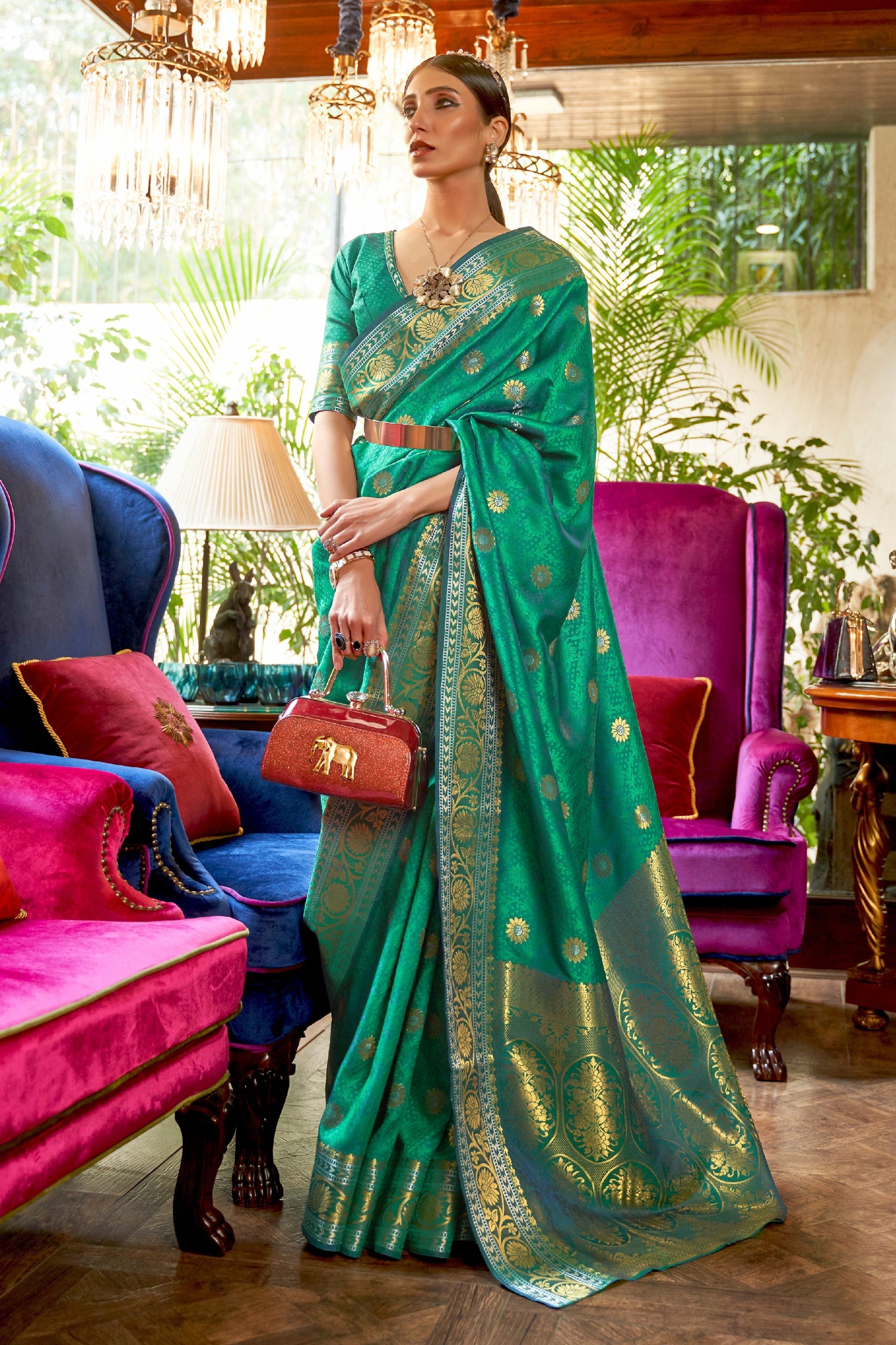 शानदार बुनाई का काम हरे रंग की कला रेशम कपड़े की साड़ी