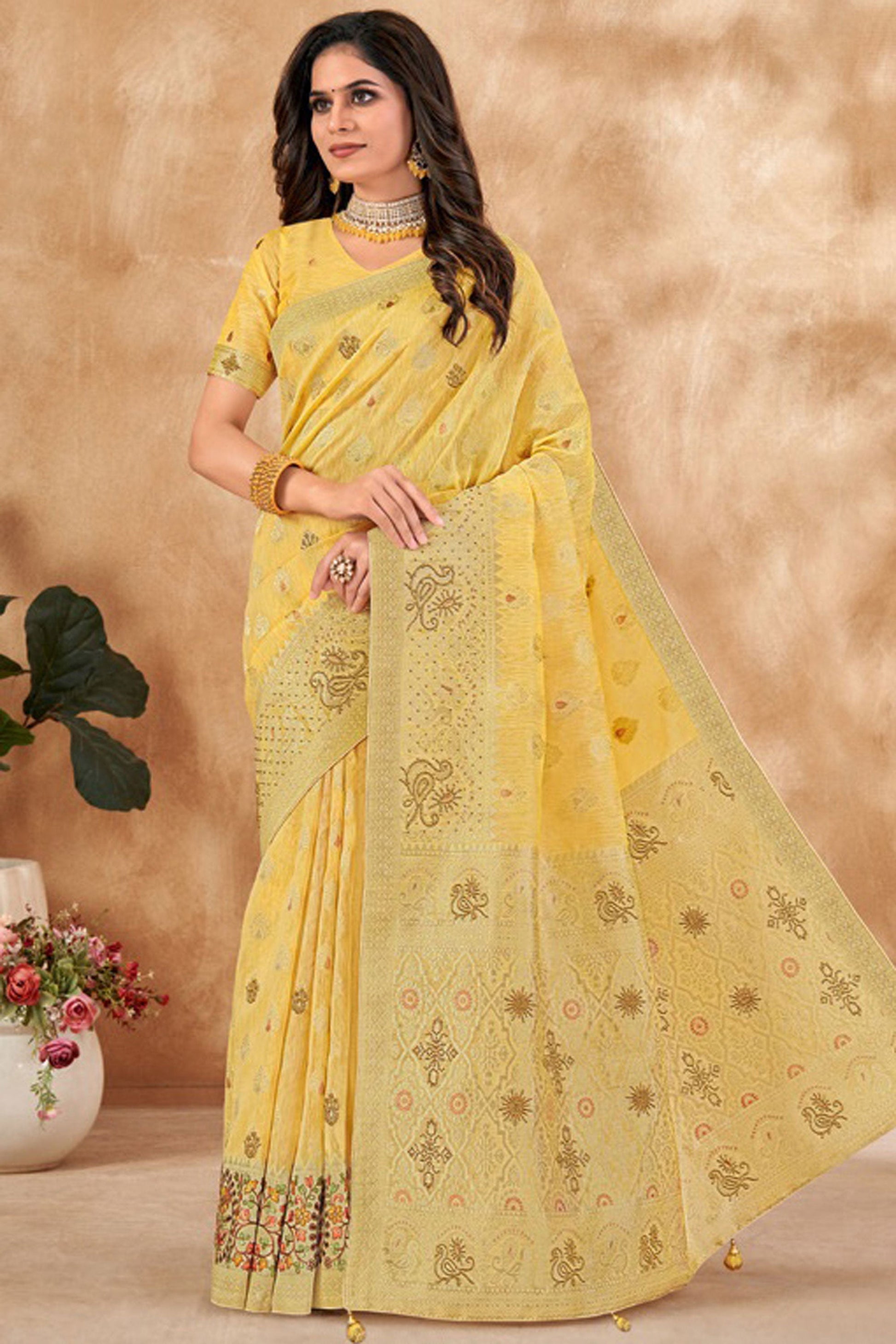 पीले रंग की शानदार कोरा सिल्क फैब्रिक साड़ी फॉयल प्रिंटेड वर्क के साथ