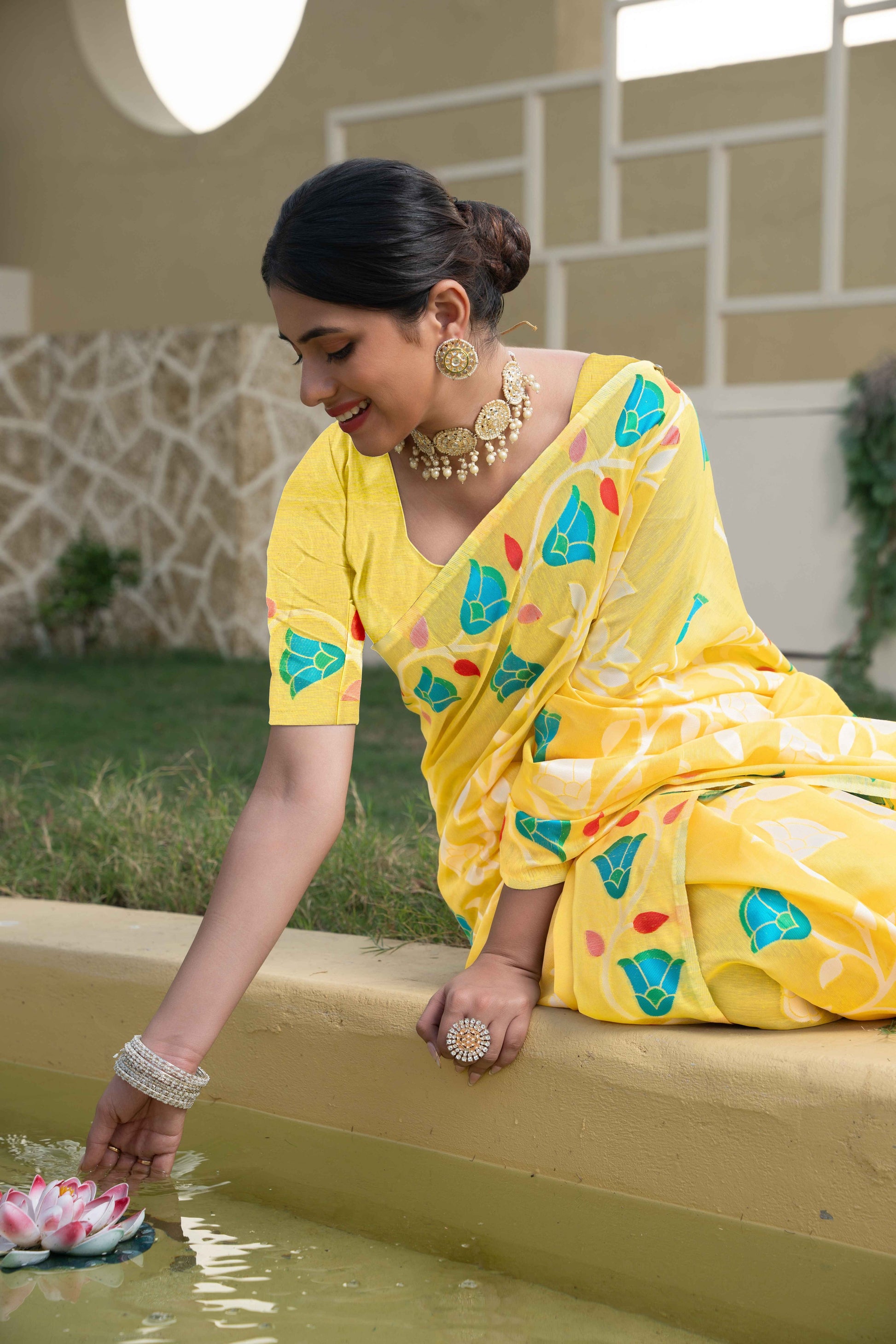 पीले रंग की जामदानी सॉफ्ट कॉटन साड़ी अनस्टिच्ड ब्लाउज पीस के साथ