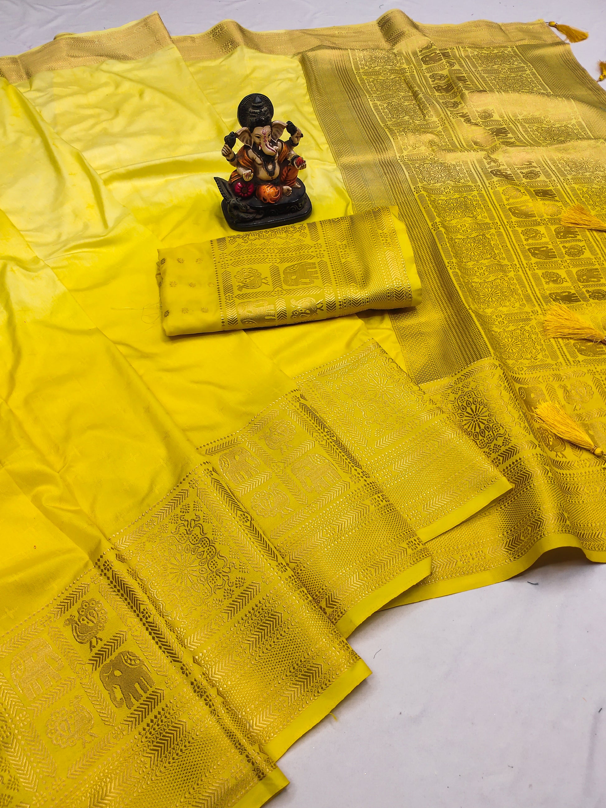 पीले रंग की सुपीरियर शुद्ध गाला डोला सिल्क साड़ी भारी हाथ डाईड और ज़री बॉर्डर