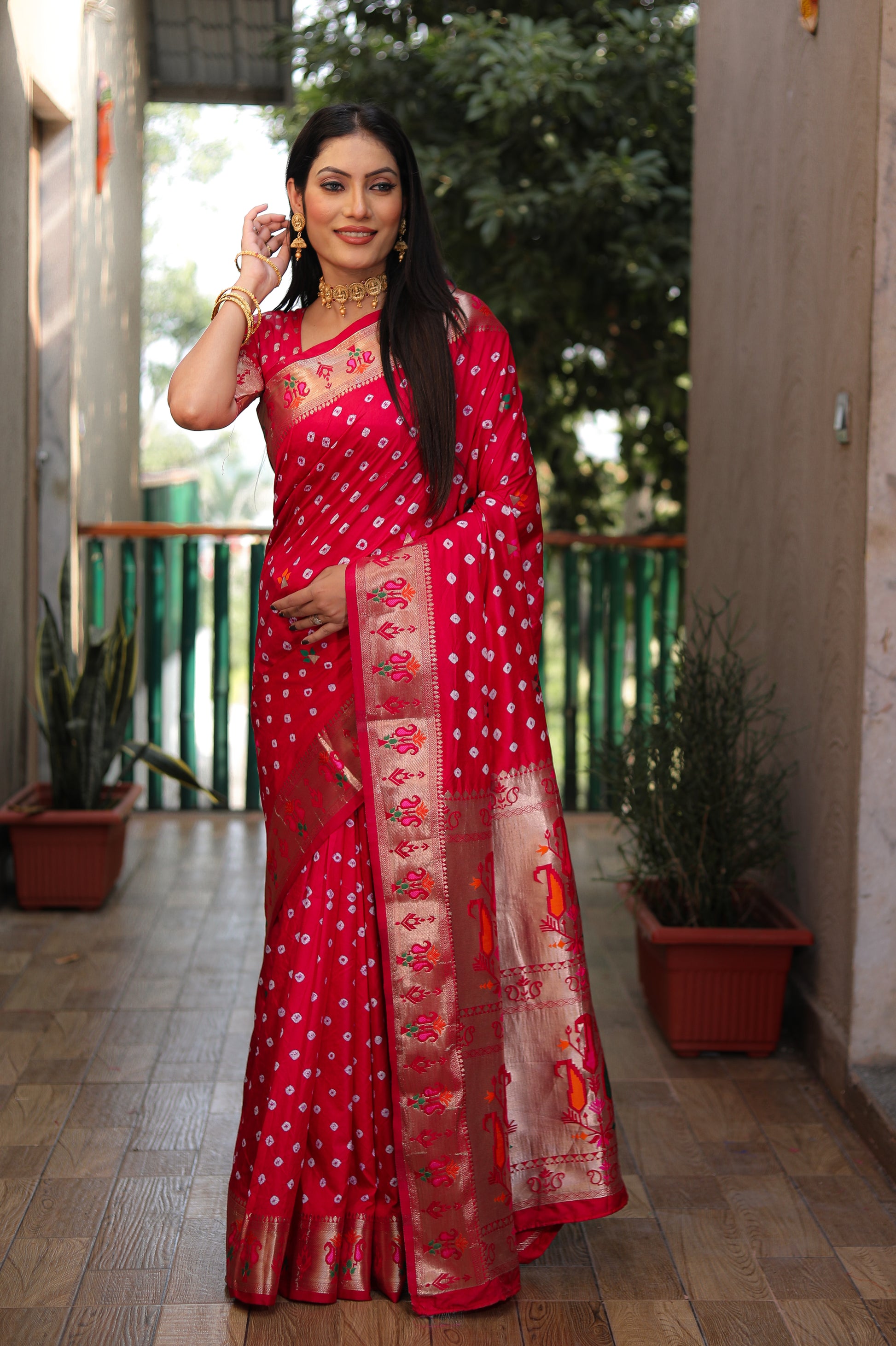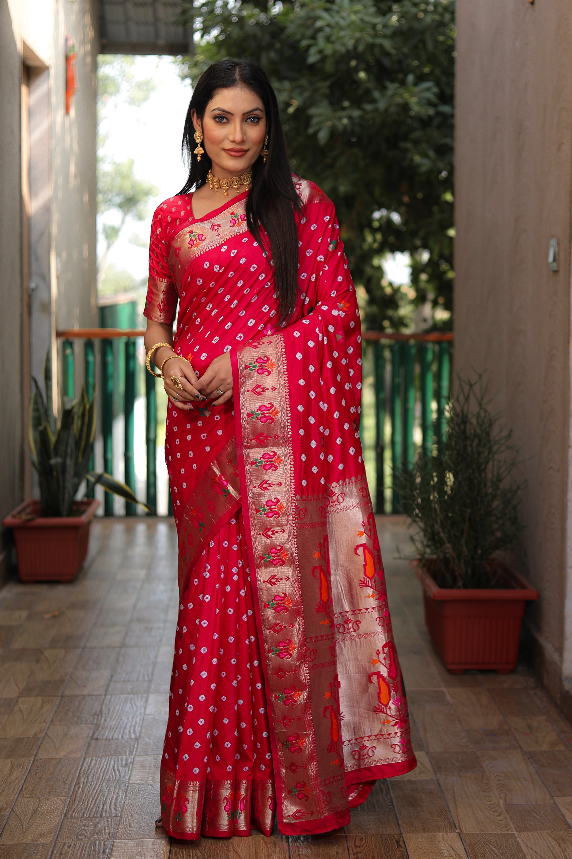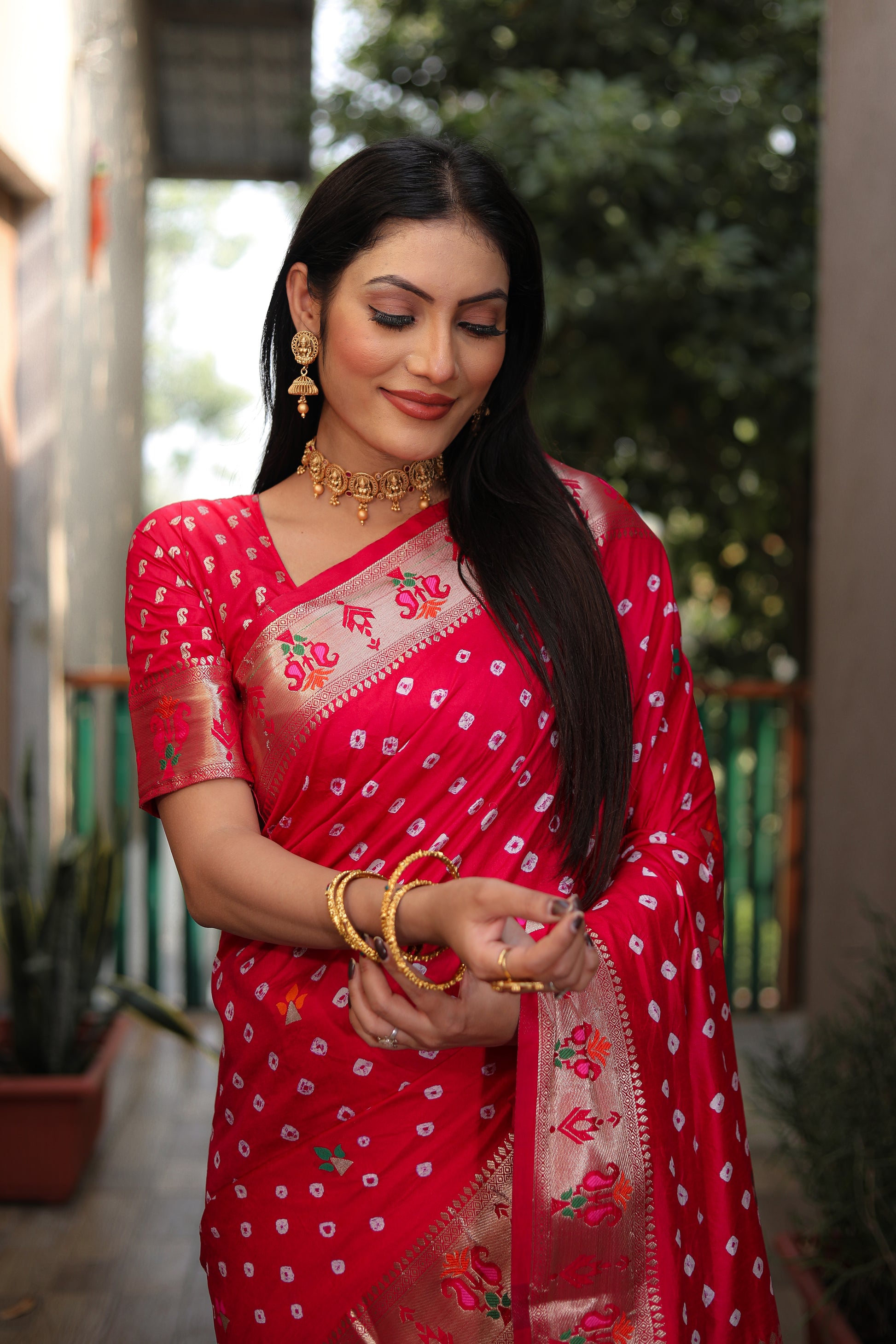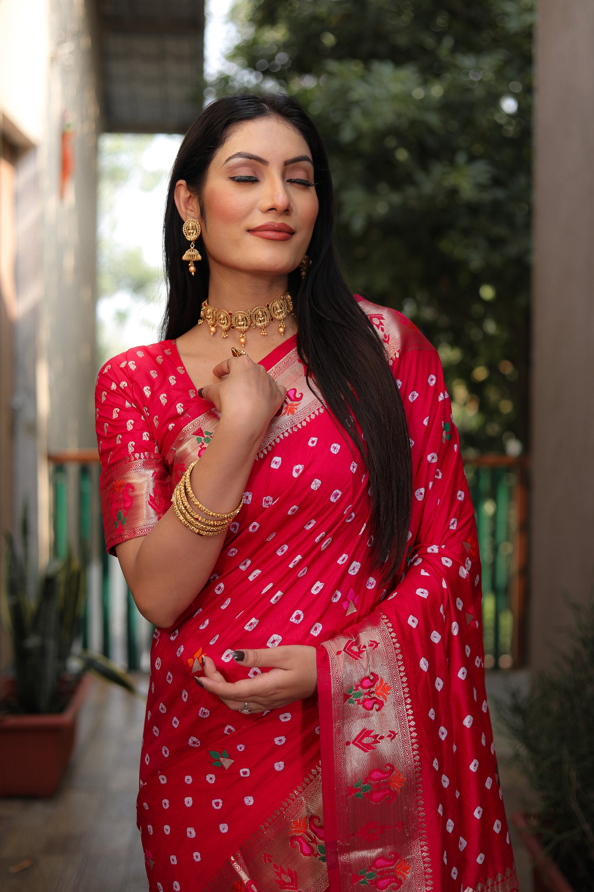 लाल योगेश्वरी डोला नरम रेशम बंधेज साड़ी जरी बुनाई बुटी के साथ