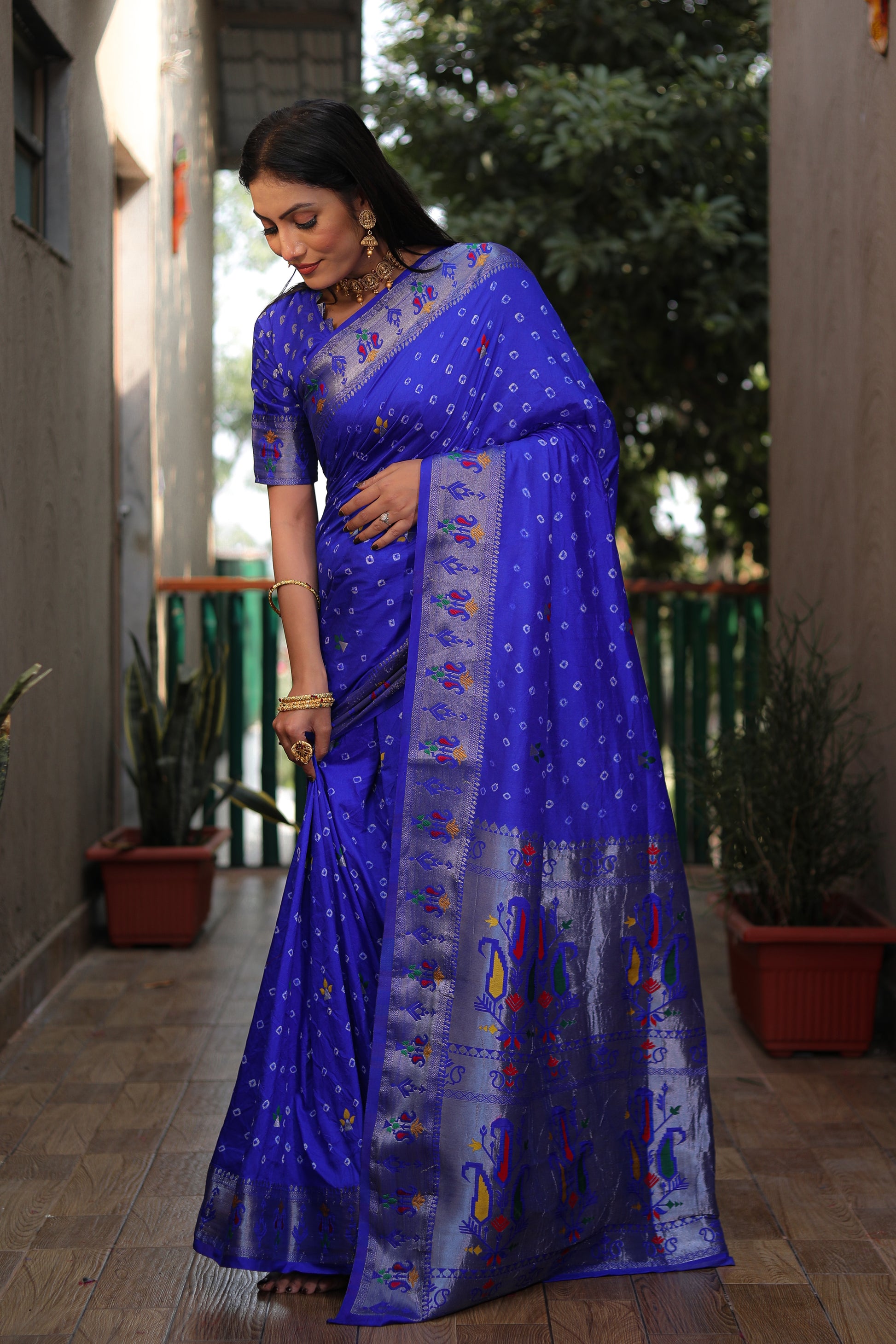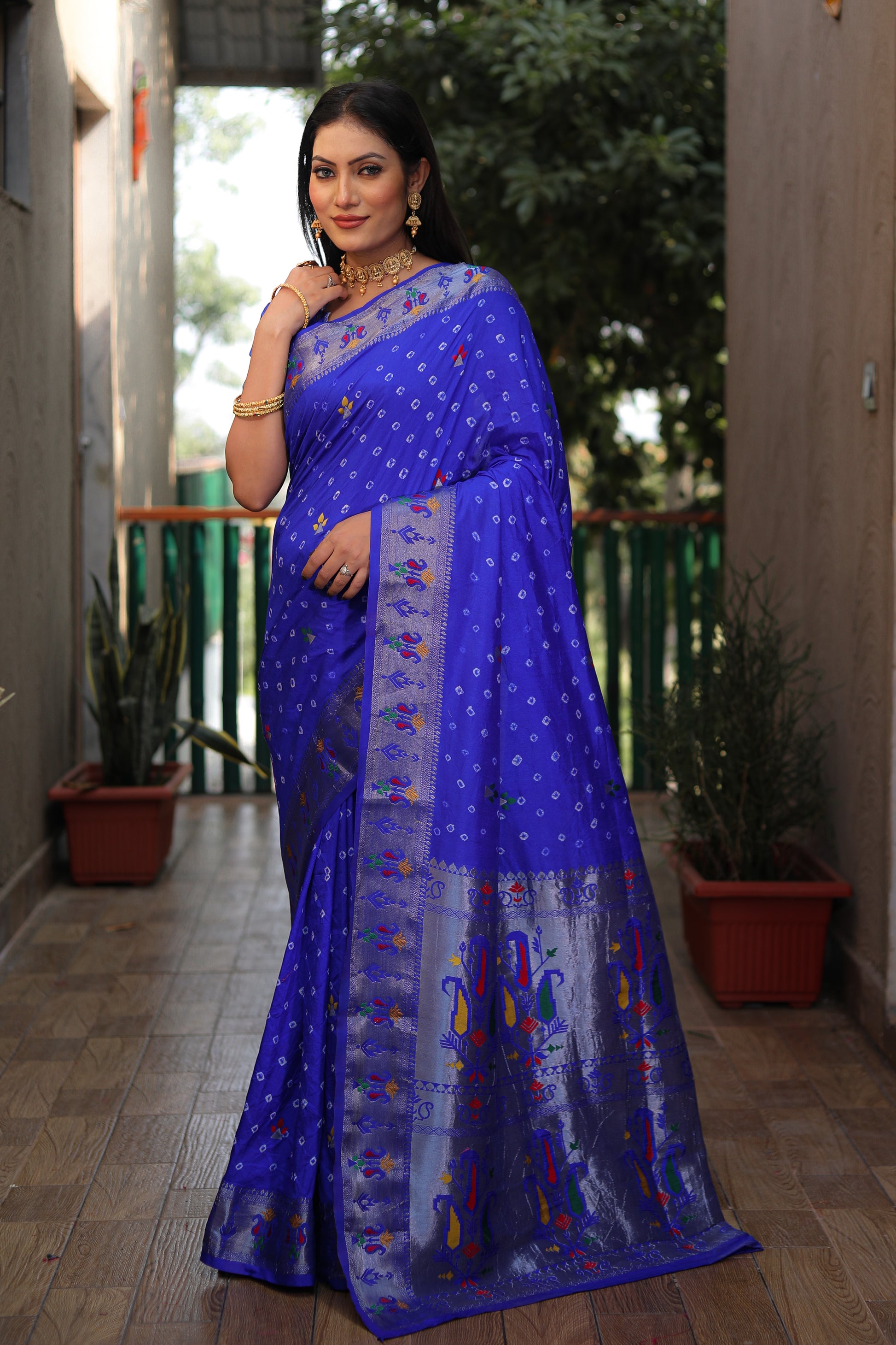 नीली योगेश्वरी डोला नरम रेशम बंधेज साड़ी जरी बुनाई बुटी के साथ