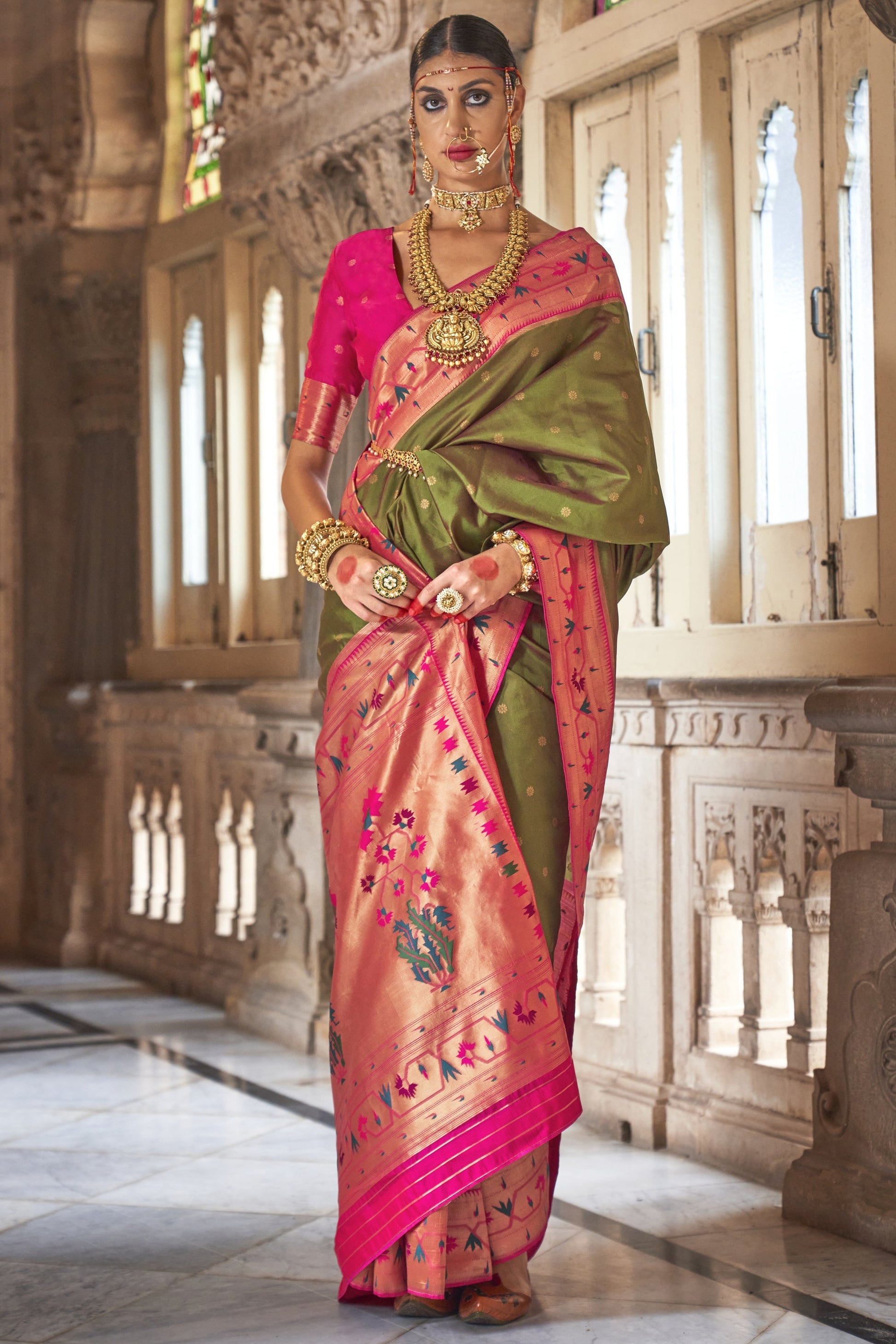 Text blockArt Silk Fabric Weaving Work Rich Green Color Nauvari Style Saree With Contrast Blouse