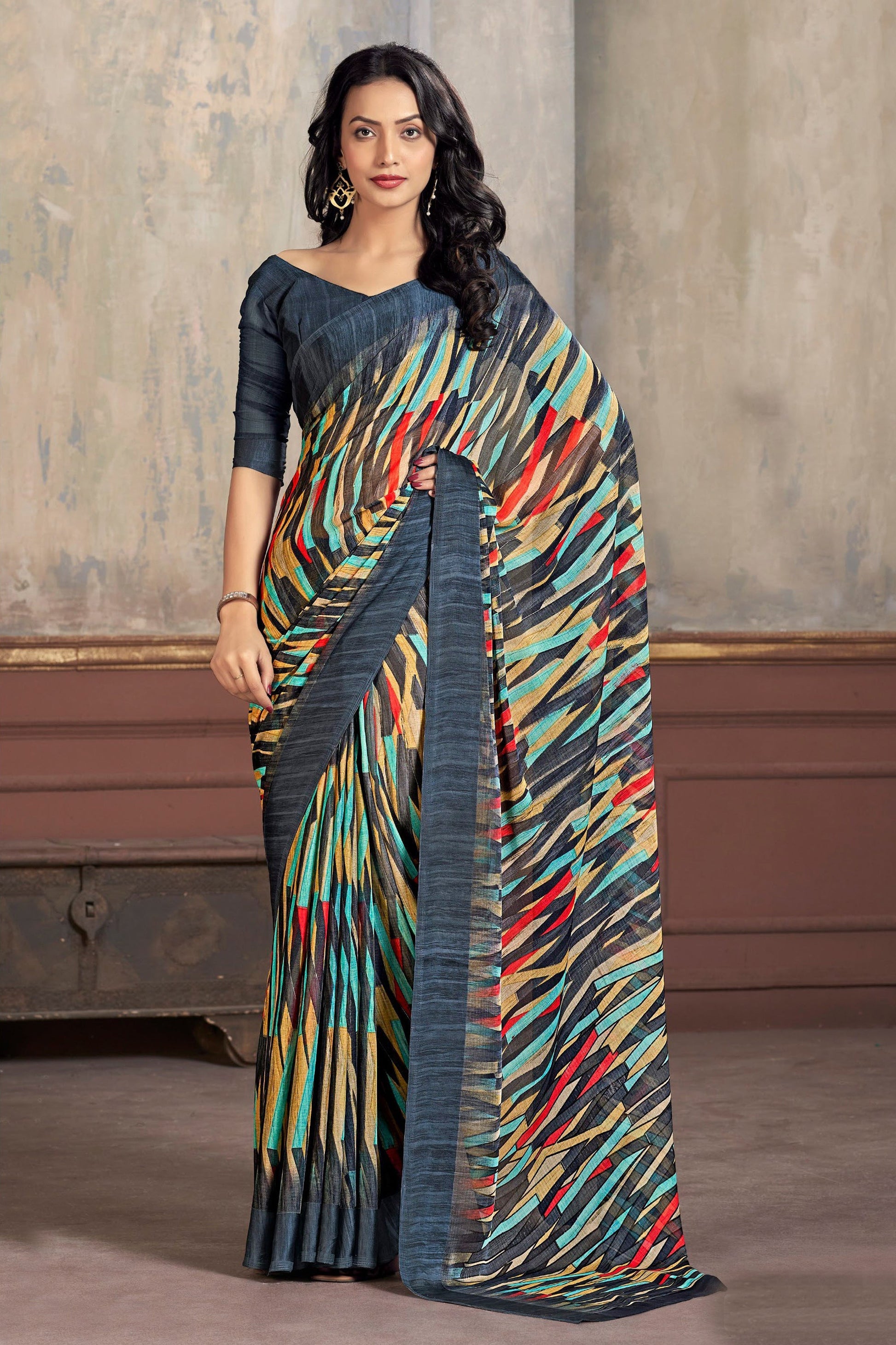 Attractive Multi Color Abstract Print Chiffon Fabric Simple Saree