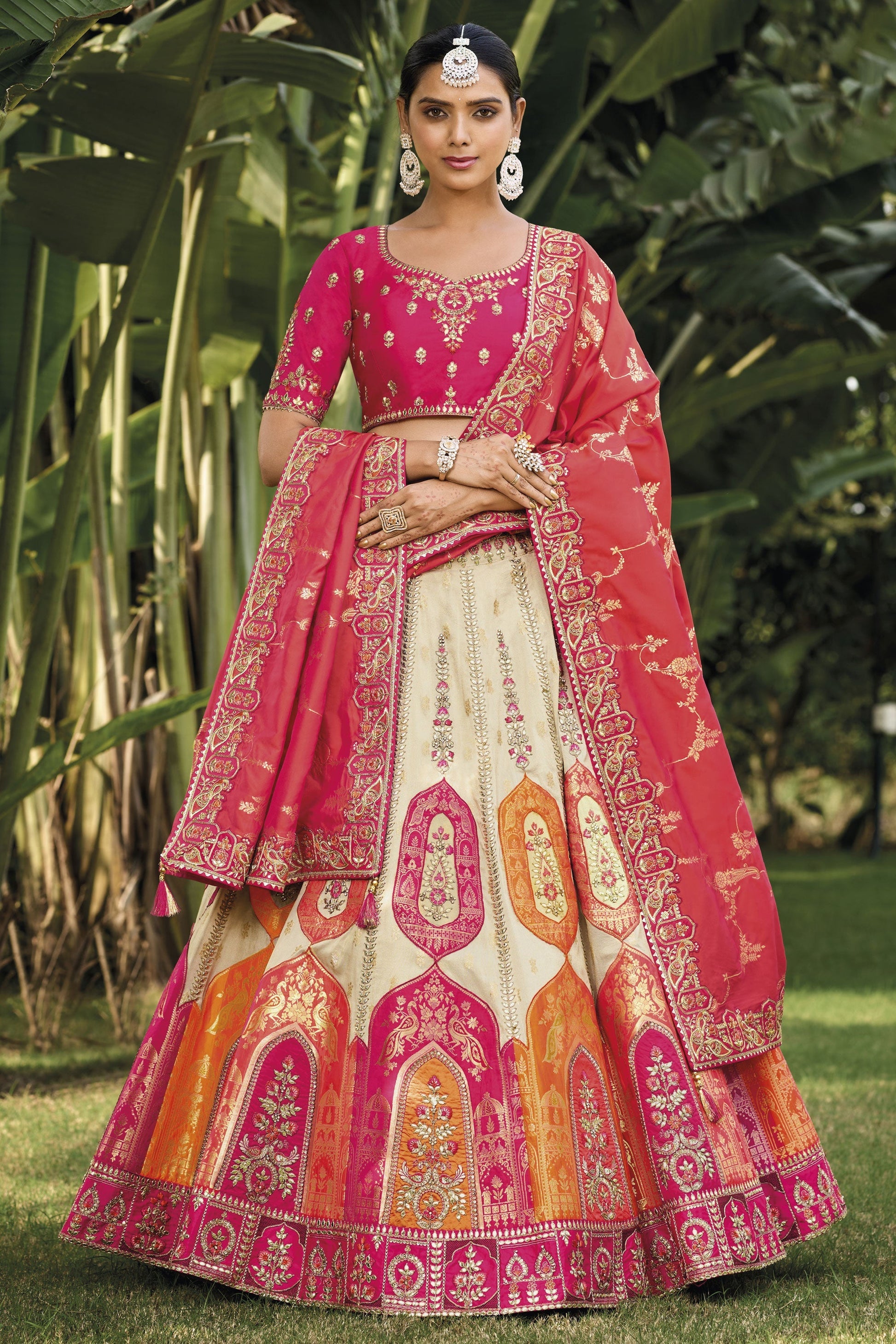 Banarasi Silk Fabric Off White Color Riveting Lehenga With Jacquard Work