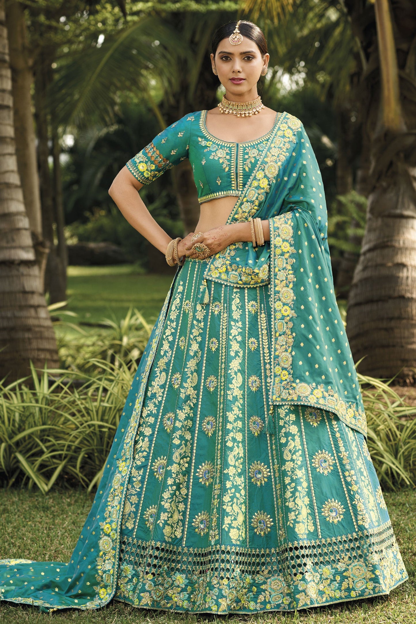 Text blockBanarasi Silk Fabric Sea Green Color Pleasance Lehenga With Jacquard Work