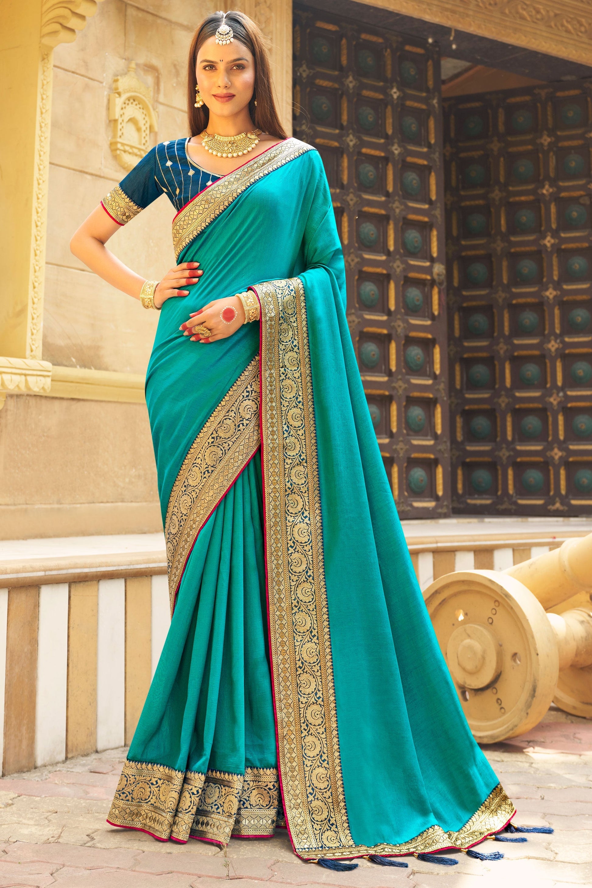 Banglori Silk Fabric Cyan Color Excellent Saree With Border Work