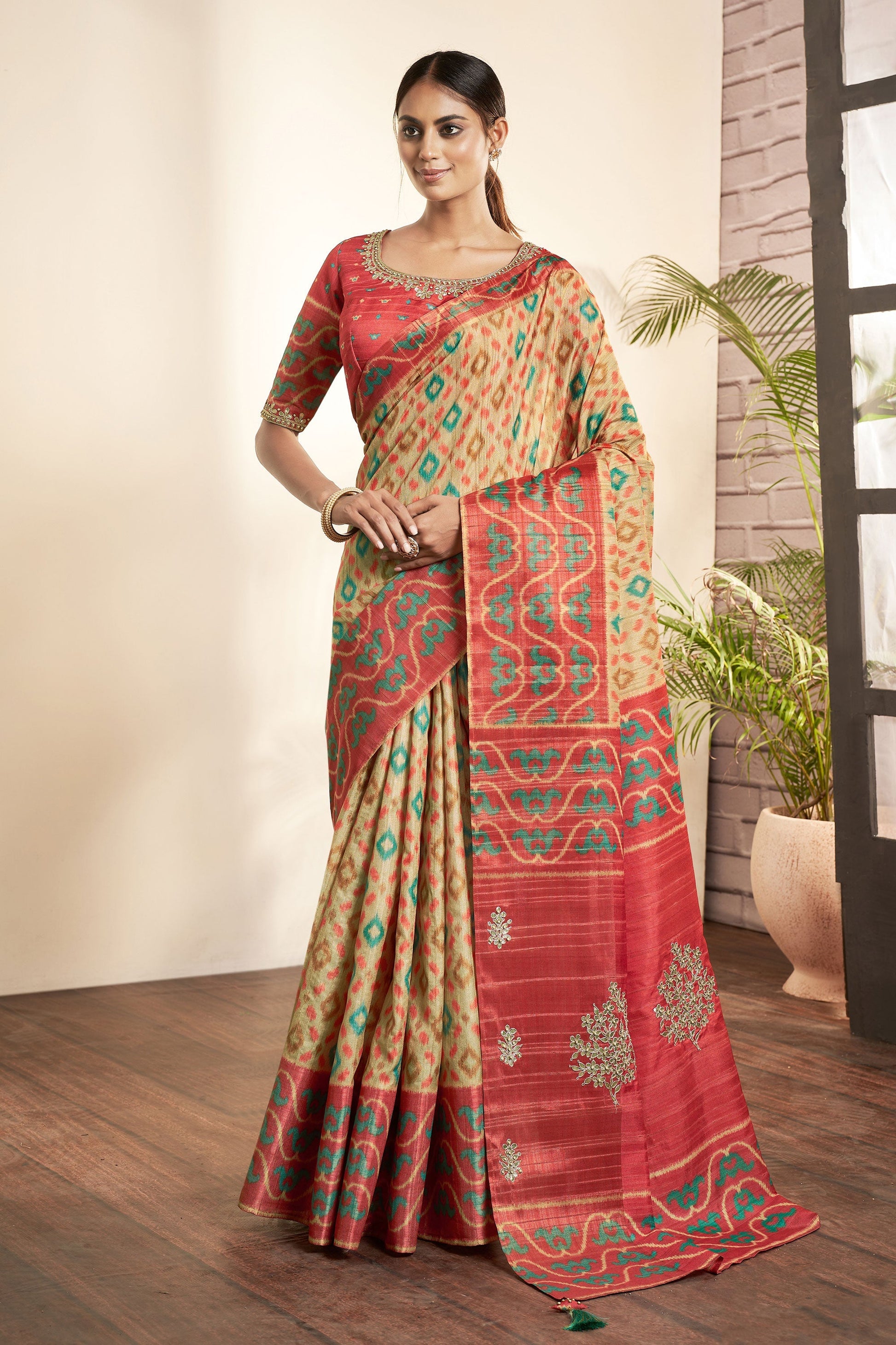 Bhagalpuri Silk Fabric Beige Color Pleasance Saree With Printed Work