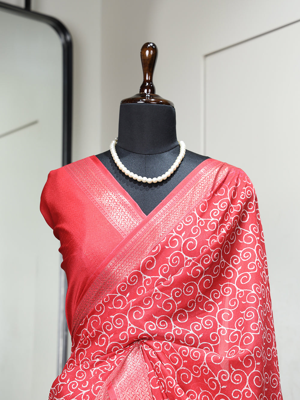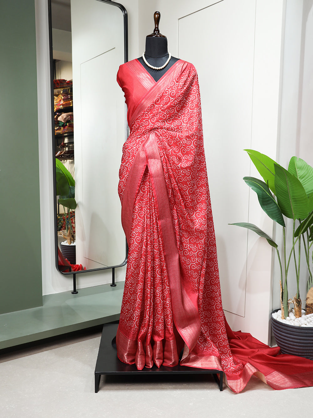 Crimson Color Printed With Zari Border Dola Silk Saree