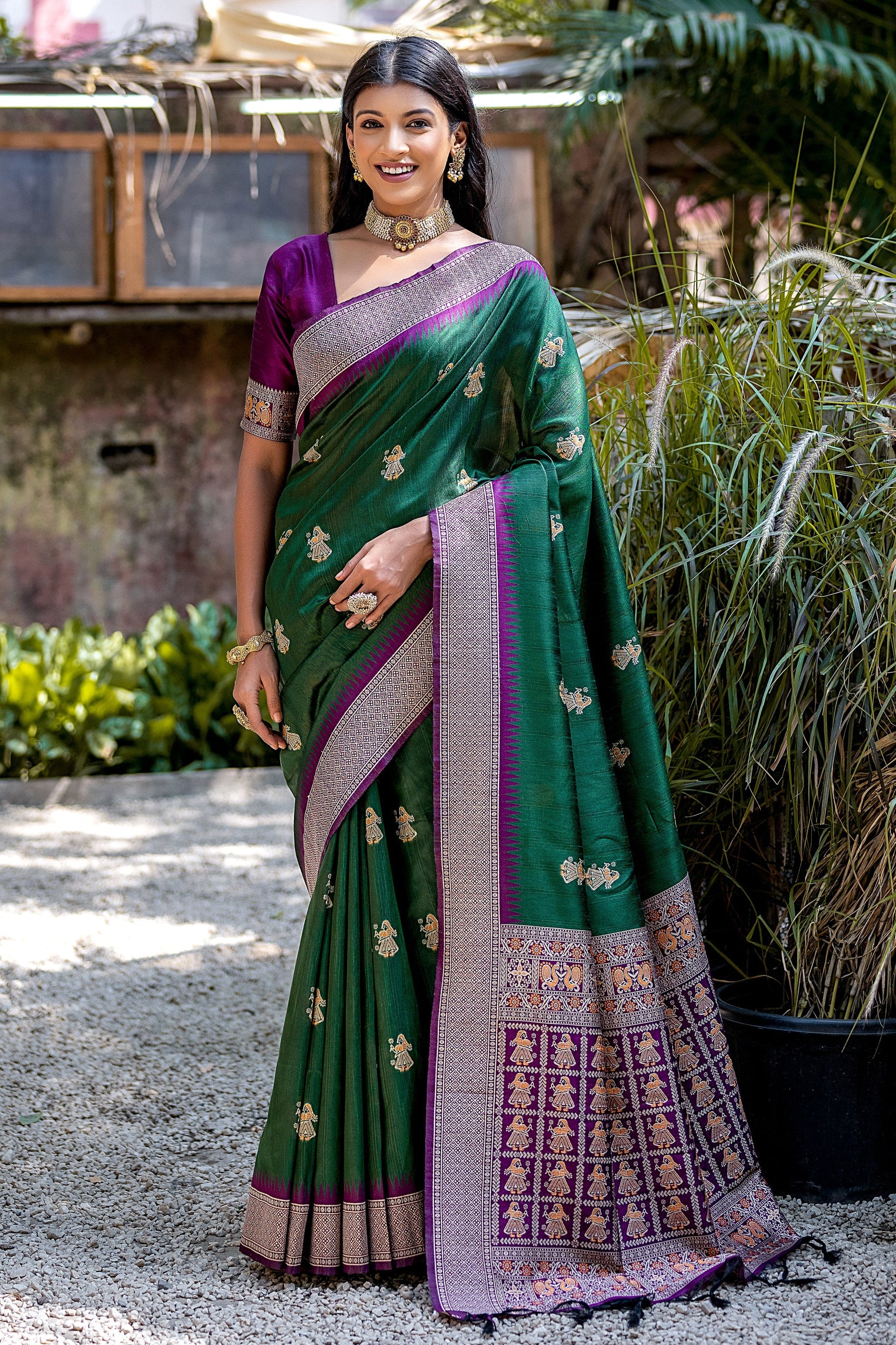 Get your hands on this premium quality Function Wear Designer Saree, expertly crafted from Tussar Silk fabric. Boasting an attractive zari weaving border with meenakari butti weaves, this saree promises an upscale elegance. The set comes with a matching blouse piece measuring 0.8 meters. Please note that the saree length is 5.5 meters. We recommend dry clean only for this saree. Bear in mind there could be a slight variation in color due to different monitor settings. Get ready to shine, as this stunning saree is available for immediate shipping.