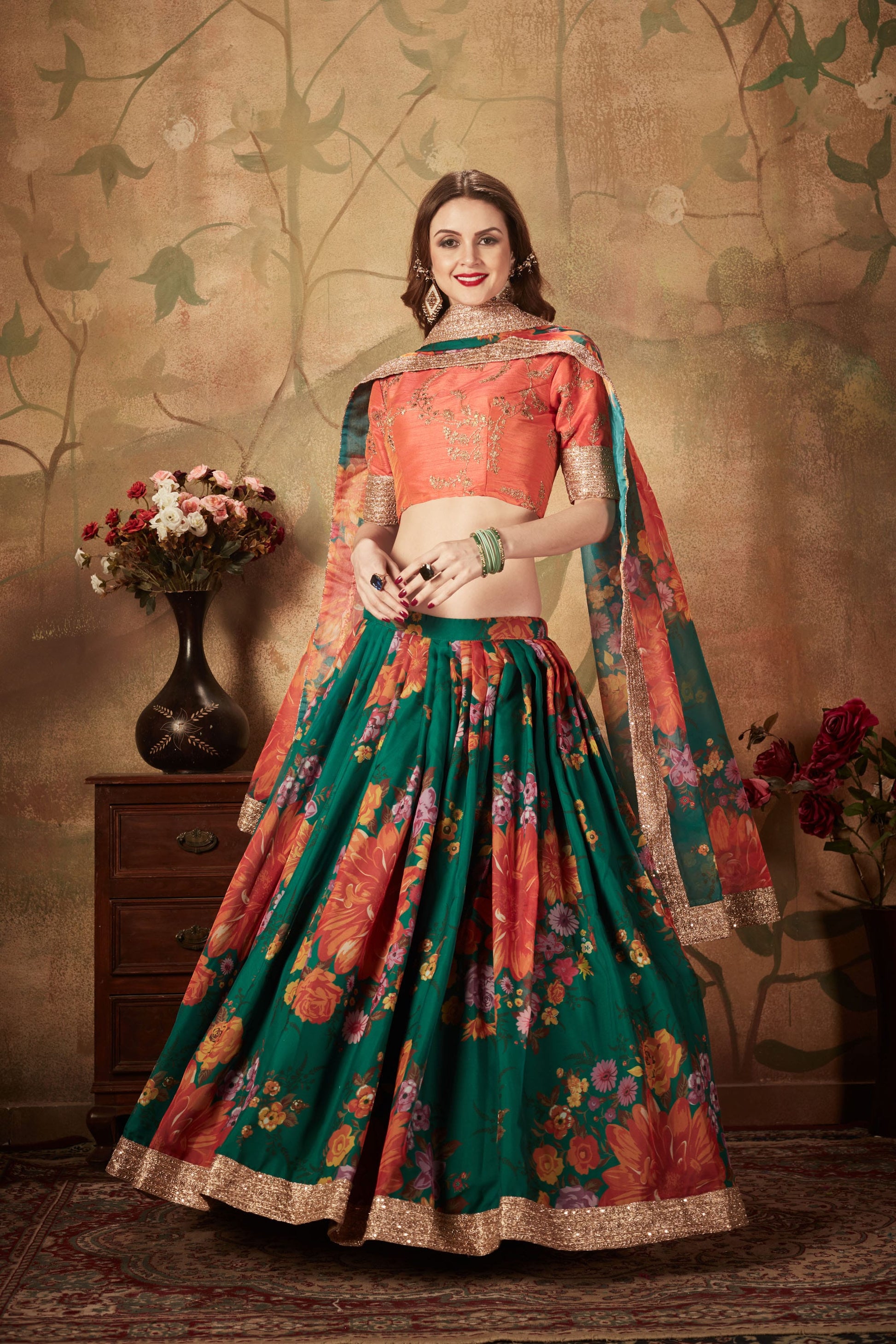 Green Color Organza Digital Print & Dori, Zari and Sequins Embroidery Work Lehenga Choli