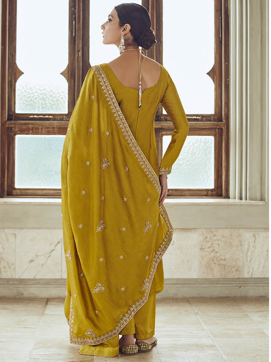 Whether you're attending a festive celebration, a glamorous party, or a special occasion, the "Mustard Yellow Premium Silk Embroidered Pant Style Suit" will make you the center of attention. Embrace the golden hue that complements every skin tone, and let the world marvel at your radiant charm and unmatched grace.