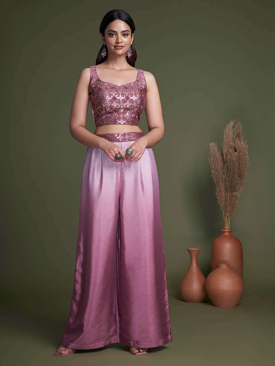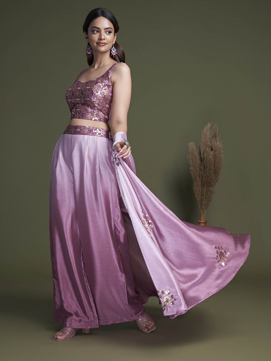 Introducing the enchanting Pink Koti Style Silk and Georgette Embroidered Palazzo Suit, a captivating ensemble that radiates grace and elegance. This stunning set features a charming purple choli, exquisitely paired with a dark purple koti and flowing purple palazzo pants.