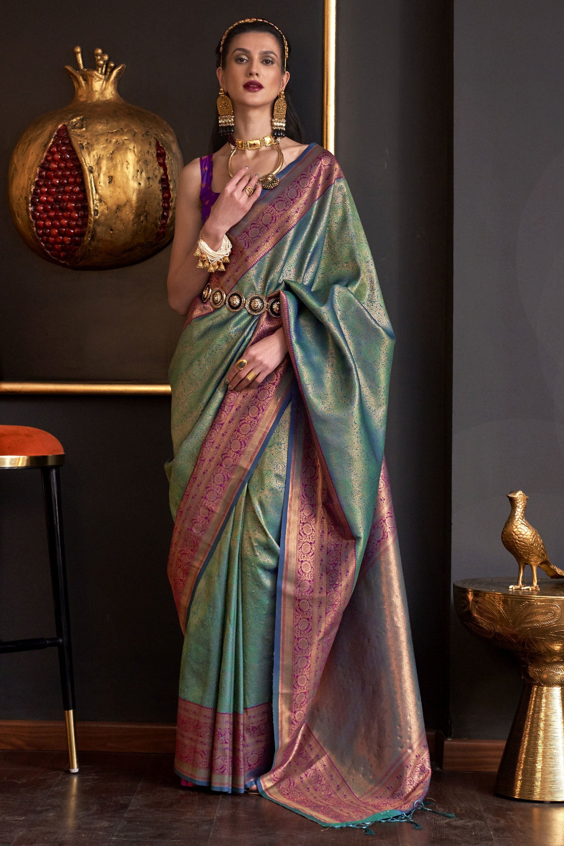 Text blockRadiant Teal Color Art Silk Weaving Work Saree