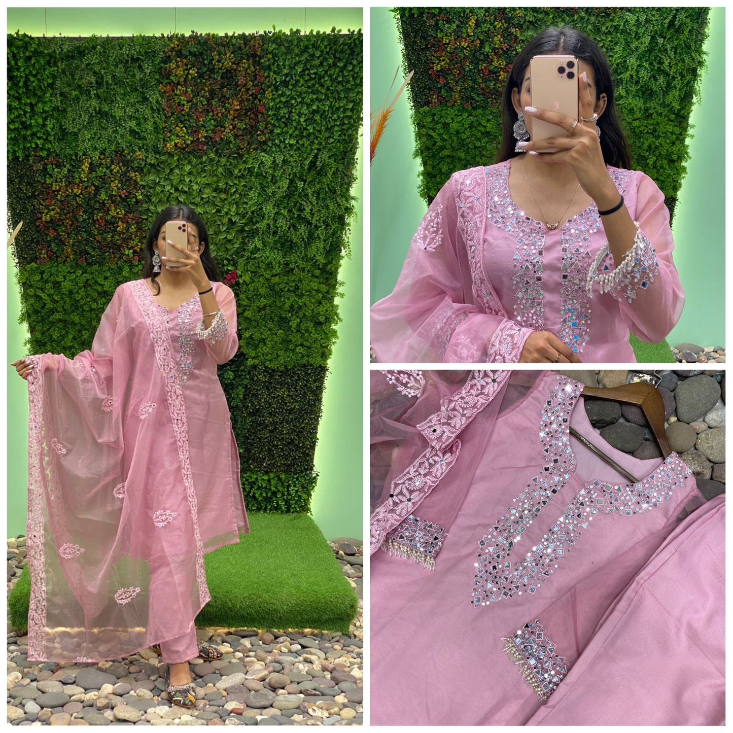 Real Mirror Work Organza Silk Stitched Shalwar Suit