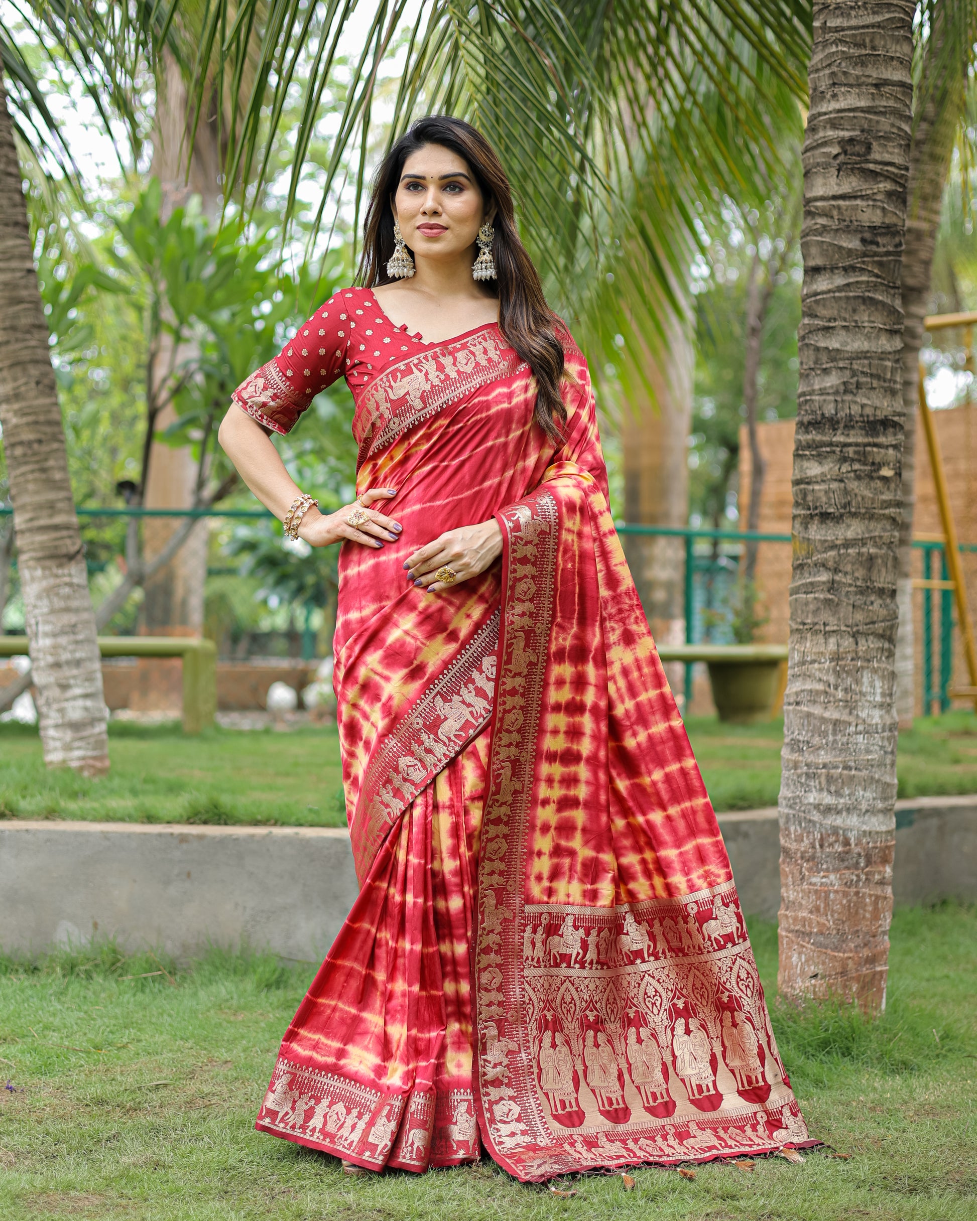 Text blockRed Color Premium And High Quality,Comfortable Sibori Work With Soft Dola Silk Saree
