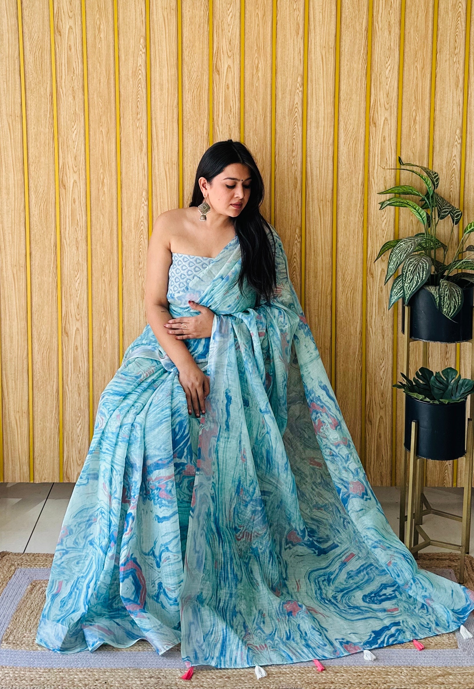 Sky Blue Color Soft Linen Cotton Digital Print Saree Very Premium And Rich Quality
