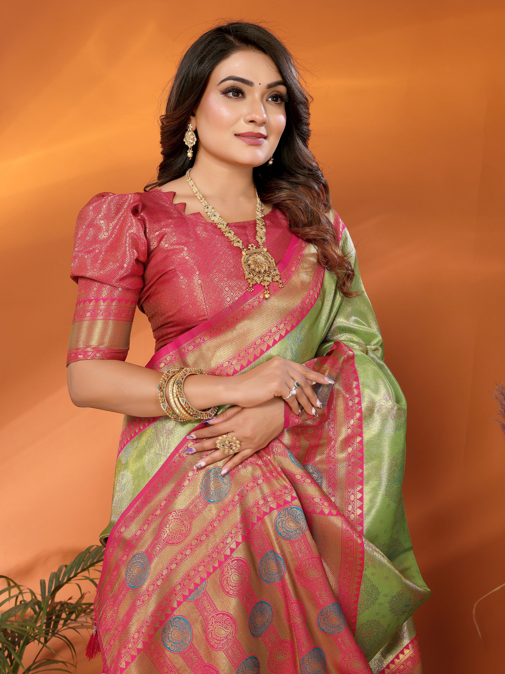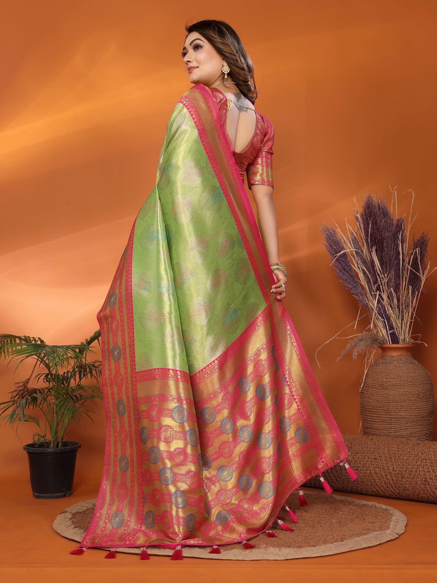 Green Sonali banarasi tissue silk sarees with all over weaving butties