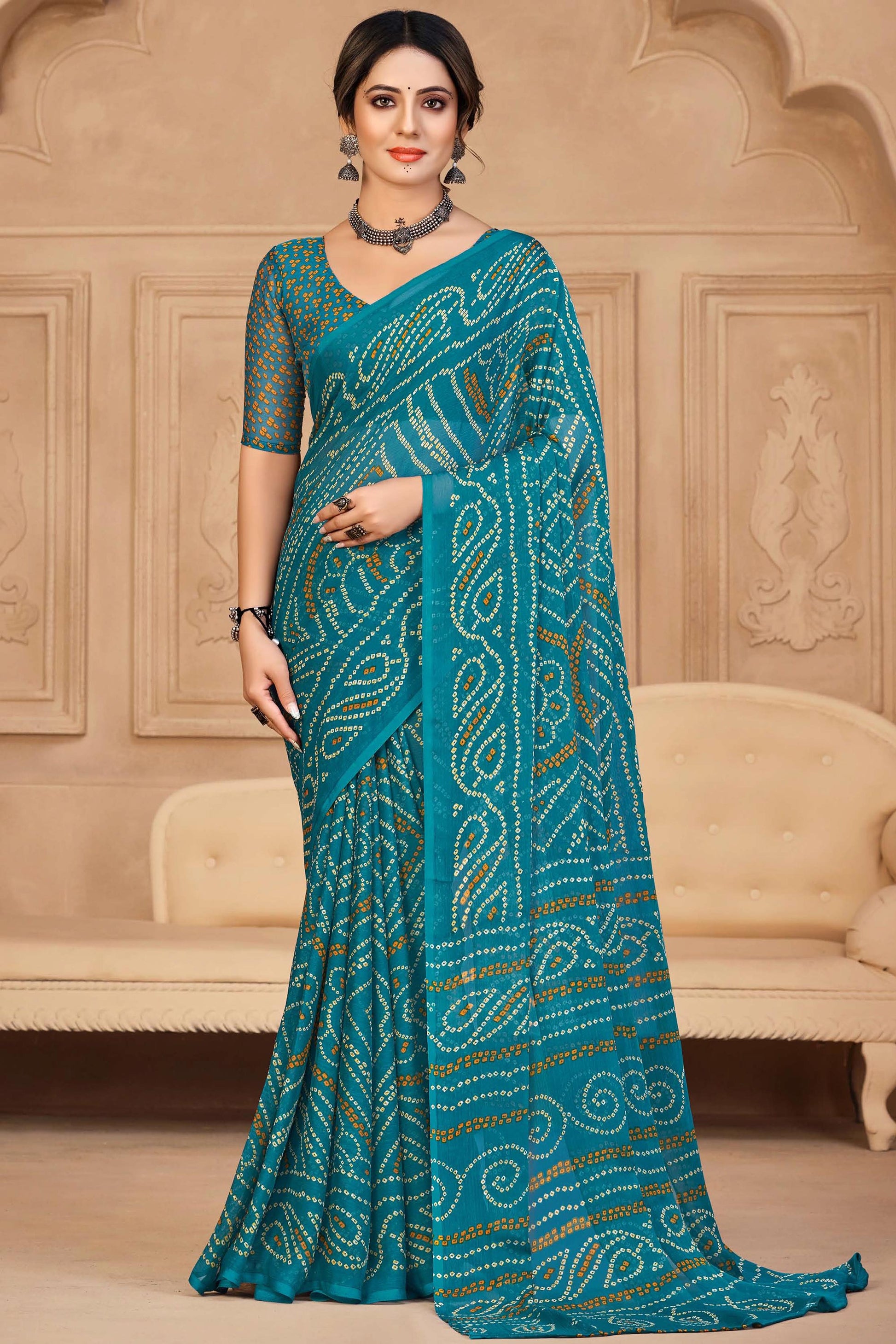 Teal Color Chiffon Fabric Bandhani Print Casual Stylish Saree