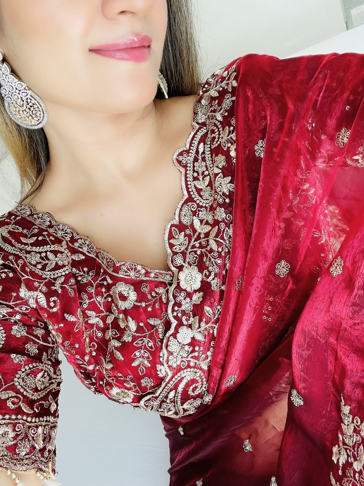 Text blockVery soft & elegant rich look fendy maroon sartin fabric with beautiful embroidery 3 mm sequence work heavy border with buttis in all over saree aarco