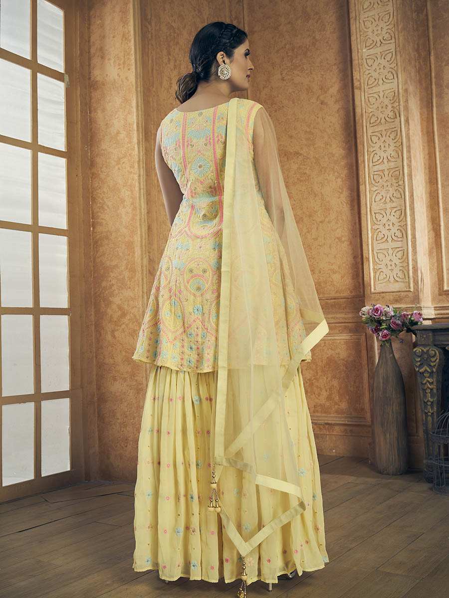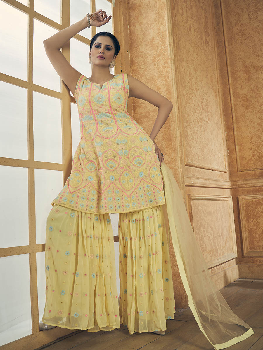 Text blockYellow Georgette Embroidered Designer Suit